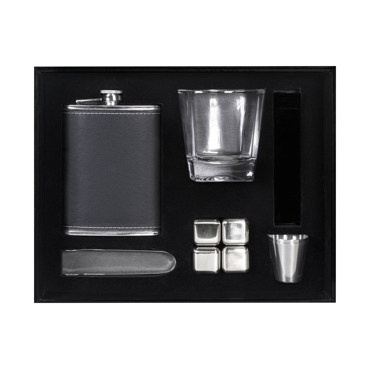 SET DE BAR ABERDEEN - Set de bar. Incluye caja rígida de regalo, licorera con funda de curpiel y tapa con rosca para evitar derrames, vaso de cristal, set de 4 cubos enfriadores con funda de terciopelo, pinzas para hielo y 2 mini vasos metálicos.