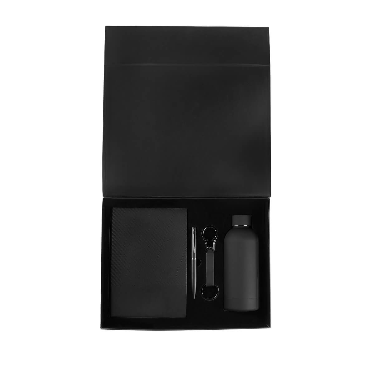 SET NOTTE - Set de regalo corporativo de 4 piezas. Incluye libreta de pasta blanda con 96 hojas a raya y listón separador, bolígrafo metálico con sistema twist, llavero de doble aro metálico con cinta de curpiel y termo de acero inoxidable de doble pared cerrado al vacío, terminado rubber que lo hace suave al tacto. Incluye caja rígida de regalo.