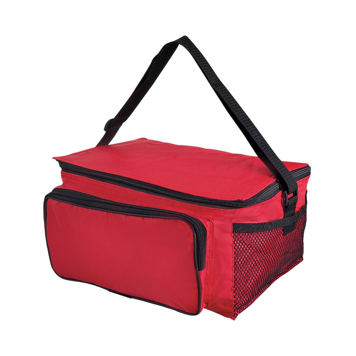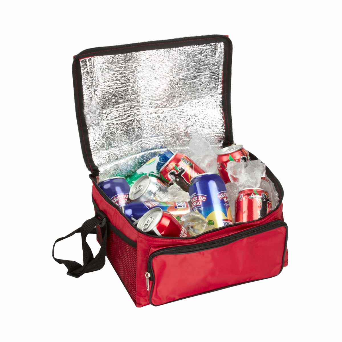 HIELERA 2 SIX - Interior metalizado plastificado e impermeable. Bolsa principal y frontal con cierre. Bolsas laterales de red. Incluye correa ajustable. Capacidad para 12 latas.