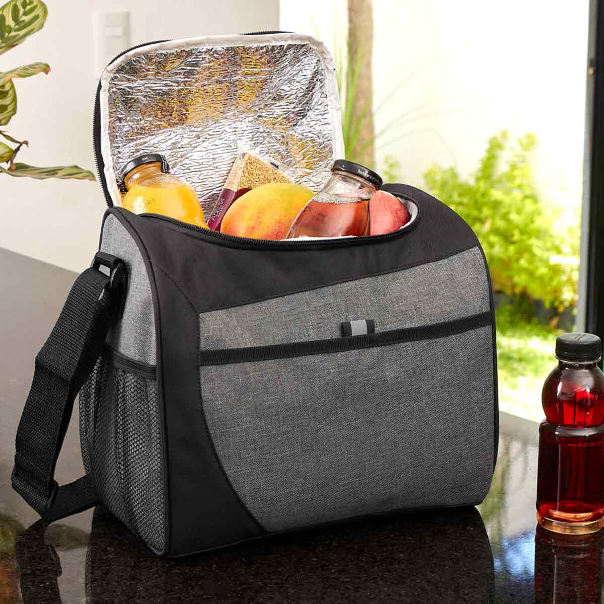 LONCHERA TIMOR - Interior metalizado. Bolsa principal y frontal con cierre. Bolsa lateral de malla y correa ajustable. Capacidad para 16 latas.