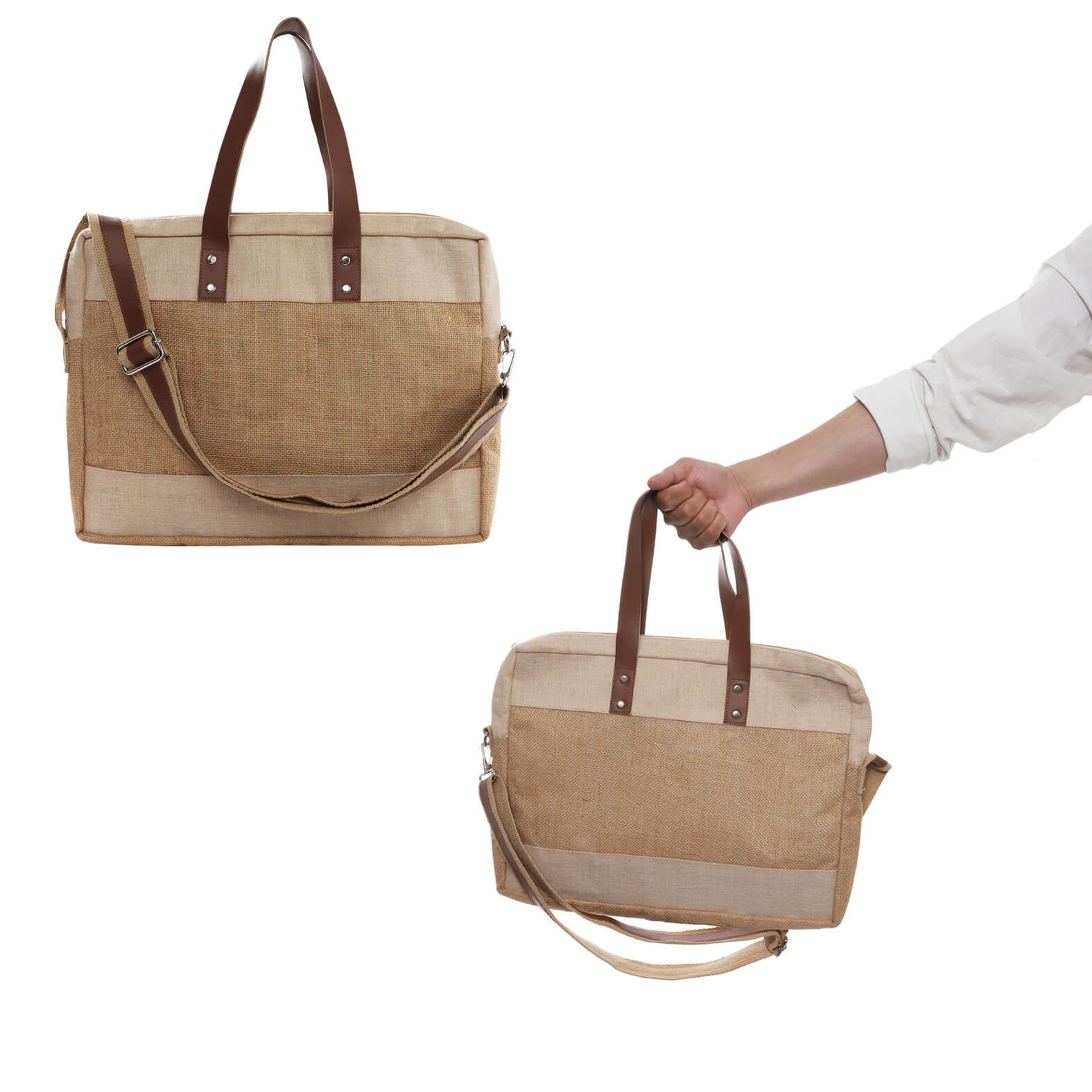 BOLSA ANTONELA - Bolsa con diseño entretejido, fuelle y 2 asas de agarre superior. Base y laterales con interior plastificado. El yute es un producto natural el cual puede presentar variaciones en tonalidades y en la urdimbre y trama de la tela.