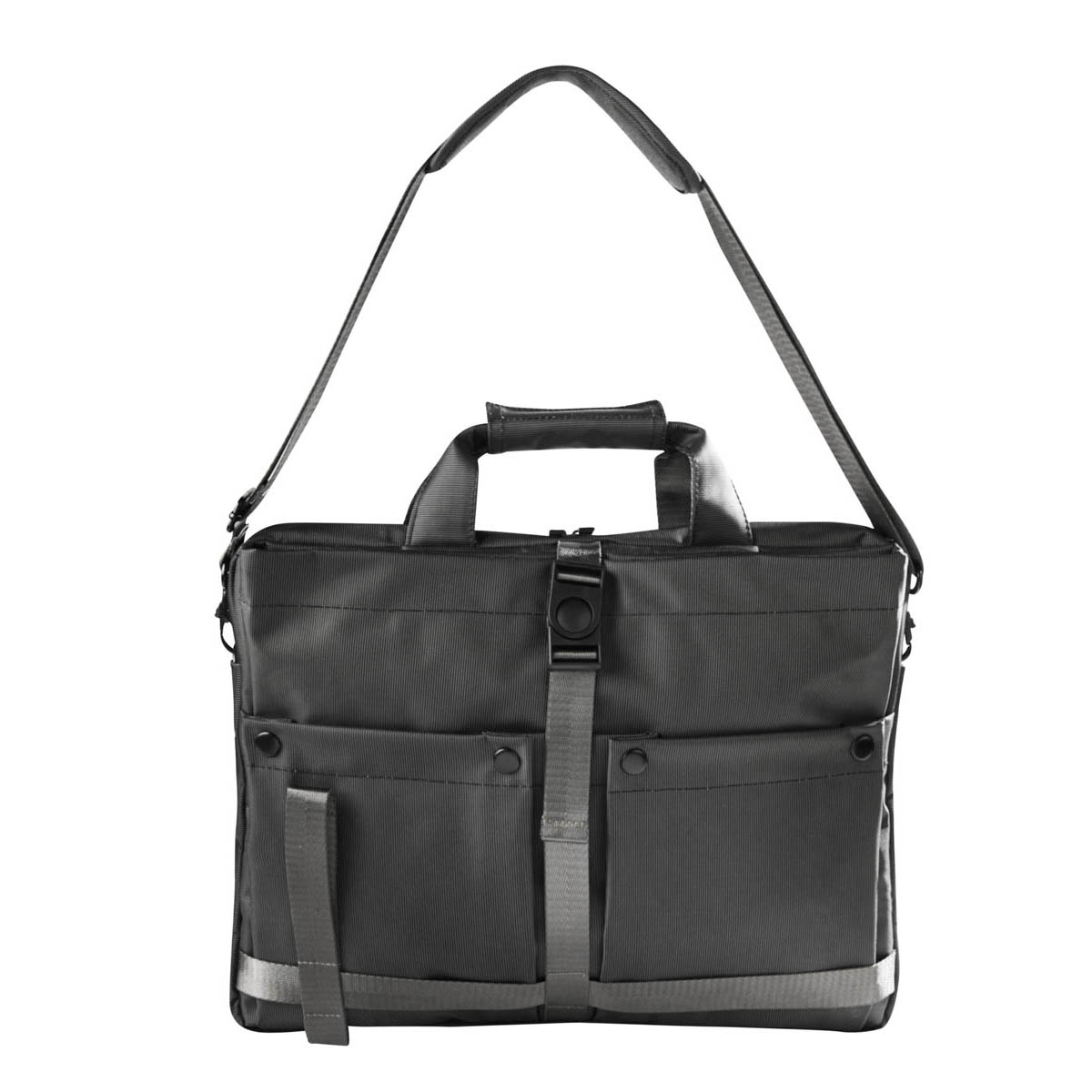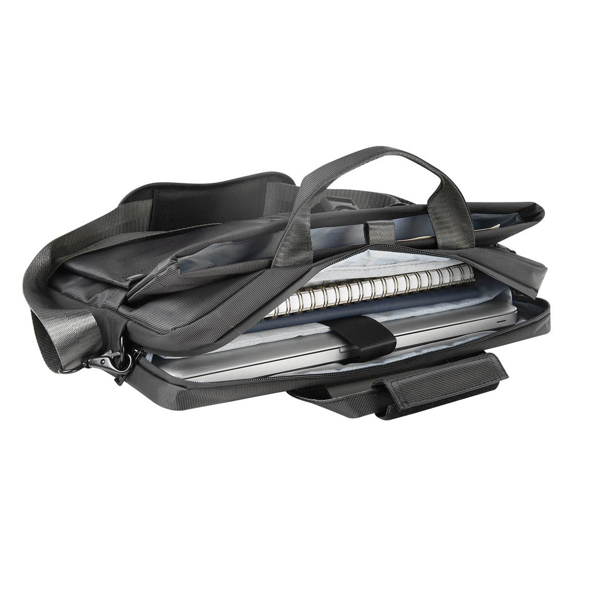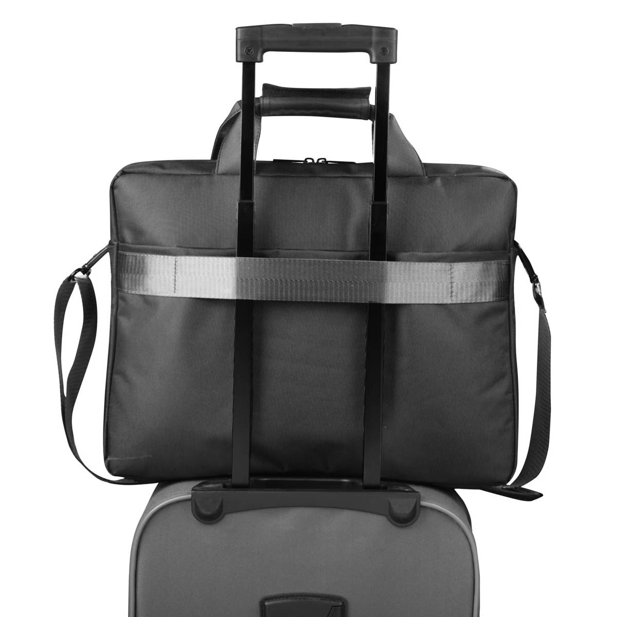 PORTAFOLIO ELON - Portafolio ejecutivo con múltiples bolsillos organizadores, ideal para llevar todo lo necesario en un solo accesorio. Su bolsillo principal con cierre, permite guardar una laptop de hasta 15''. Bolsillo frontal, con cierre de velcro y broche de plástico, ideal para mantener seguras tus pertenencias de valor, además de dos bolsillos para objetos más pequeños. Asa superior que se une por medio de velcro y un asa removible para hombro con broches metálicos. En la parte posterior, contiene una banda para transportar fácilmente en trolley.