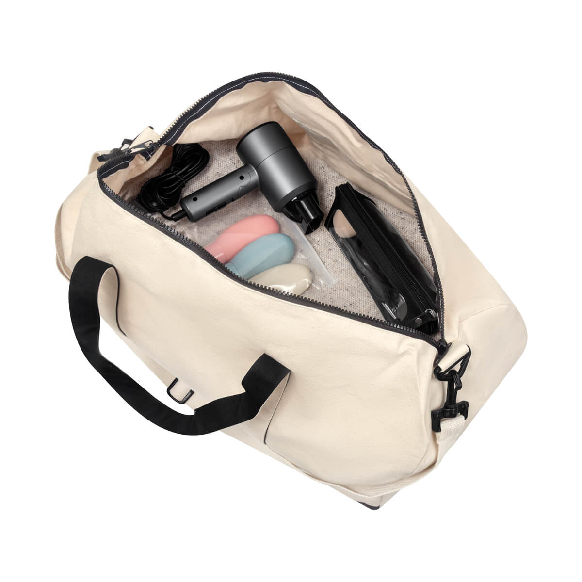 MALETA LECCO - Su compartimento principal con cierre destaca por su tamaño súper amplio, perfecto para llevar todo lo necesario con comodidad. Incluye asas de mano para un fácil agarre y una práctica asa para hombro removible, sujeta con un broche de plástico para mayor seguridad. Además, cuenta con un bolsillo frontal con cierre que brinda acceso rápido a objetos pequeños o esenciales. Esta maleta ecológica está fabricada con material algodón, es la compañera ideal para viajes o escapadas de fin de semana.
