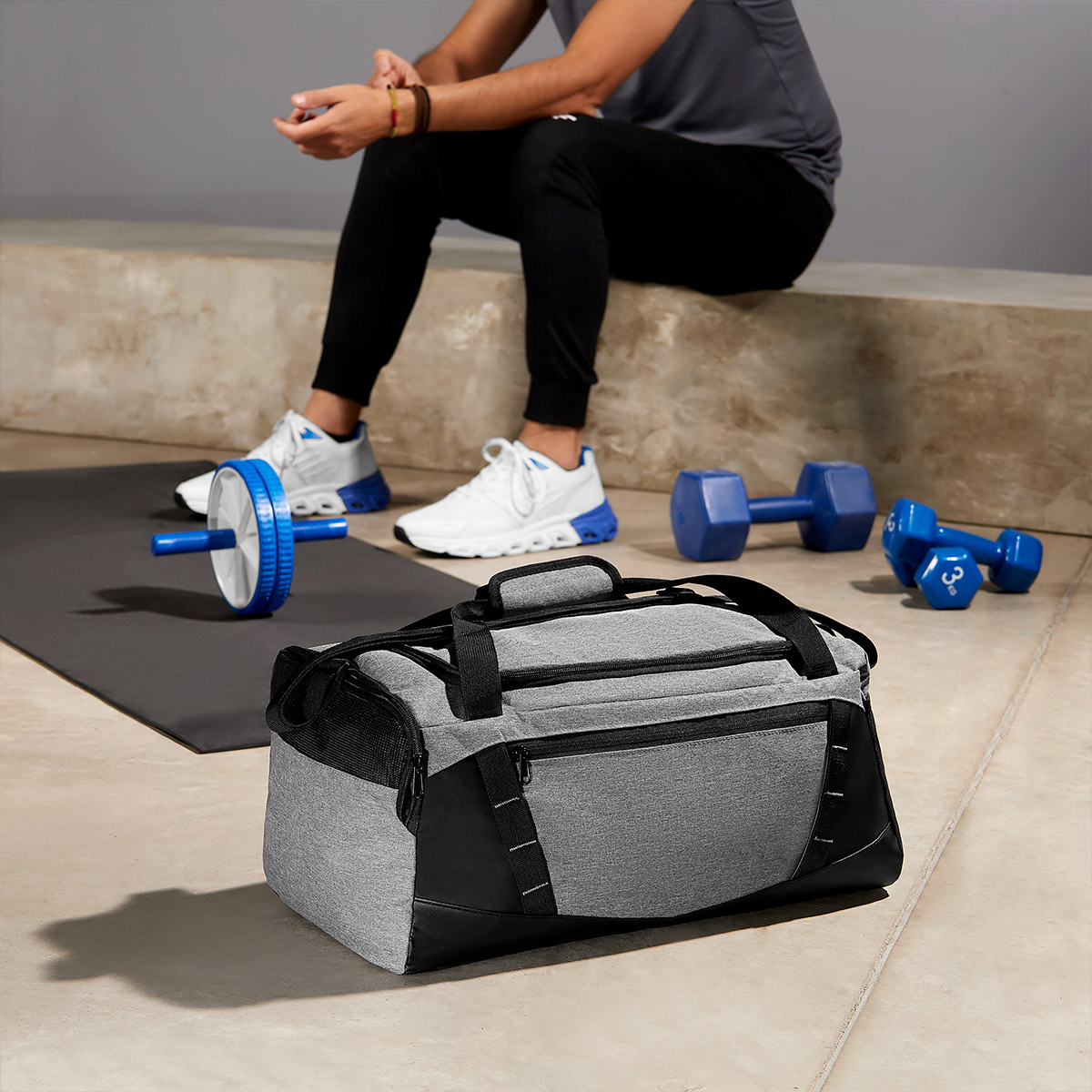 MALETA EGNI - Maleta deportiva equipada con bolsa principal y una adicional en la parte frontal, ambas con cierre. Además, cuenta con un compartimento lateral para calzado y un bolsillo lateral de malla. Incluye correa ajustable para hombro y asas de agarre superior. Las costuras frontales permiten colgar objetos en ellas.