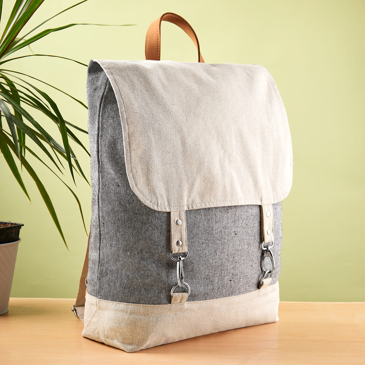 MOCHILA NATTY - Mochila ecológica de algodón reciclado. Compartimento principal con cerrado de solapa y 2 broches metálicos. Asa superior y asas para hombro ajustables.