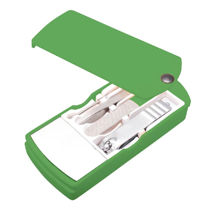 Set de manicure con espejo. Medidas: 10.3 x 4.5 x 1.8 cm Material: Plástico y acero inoxidable. Empaque: Bolsa de celofán.