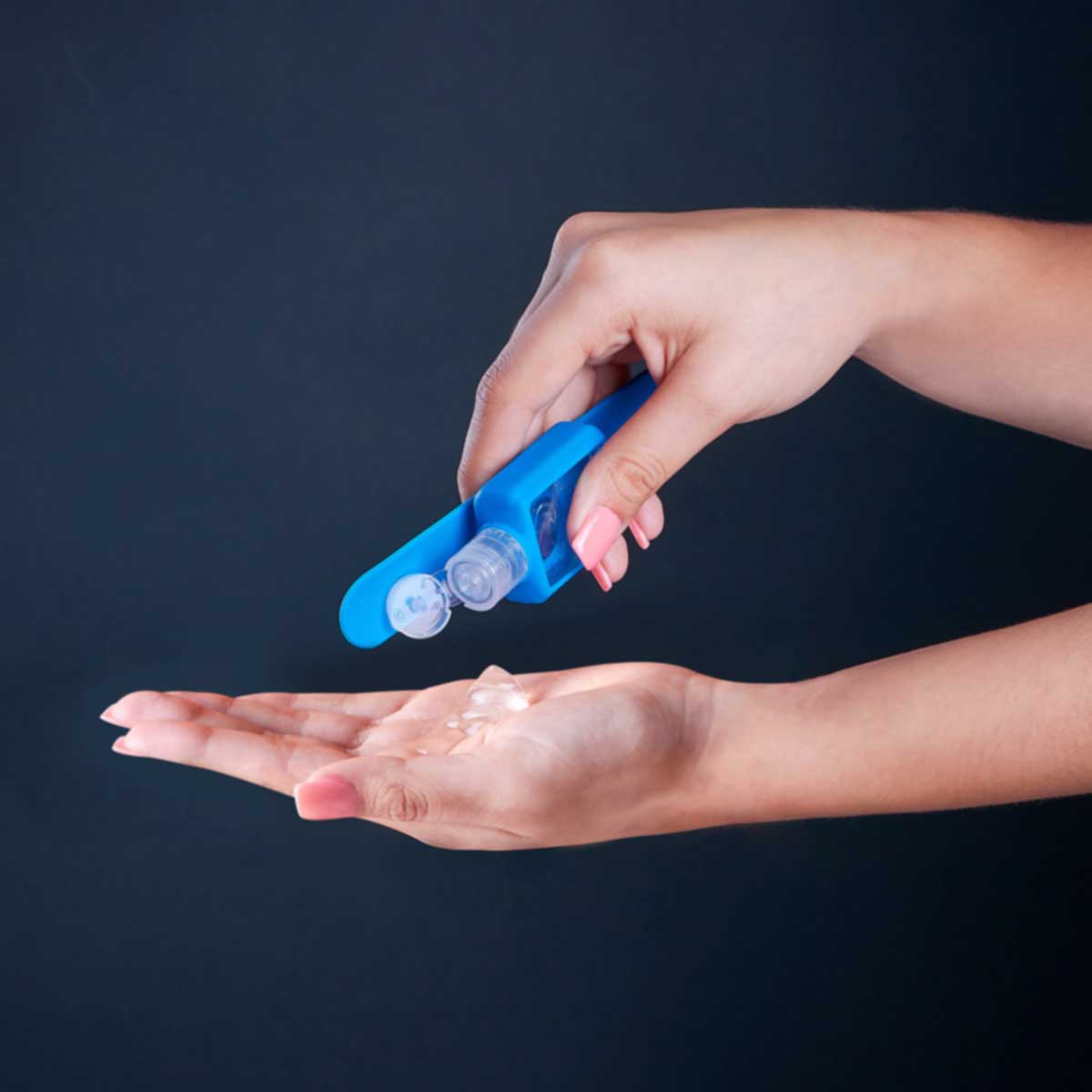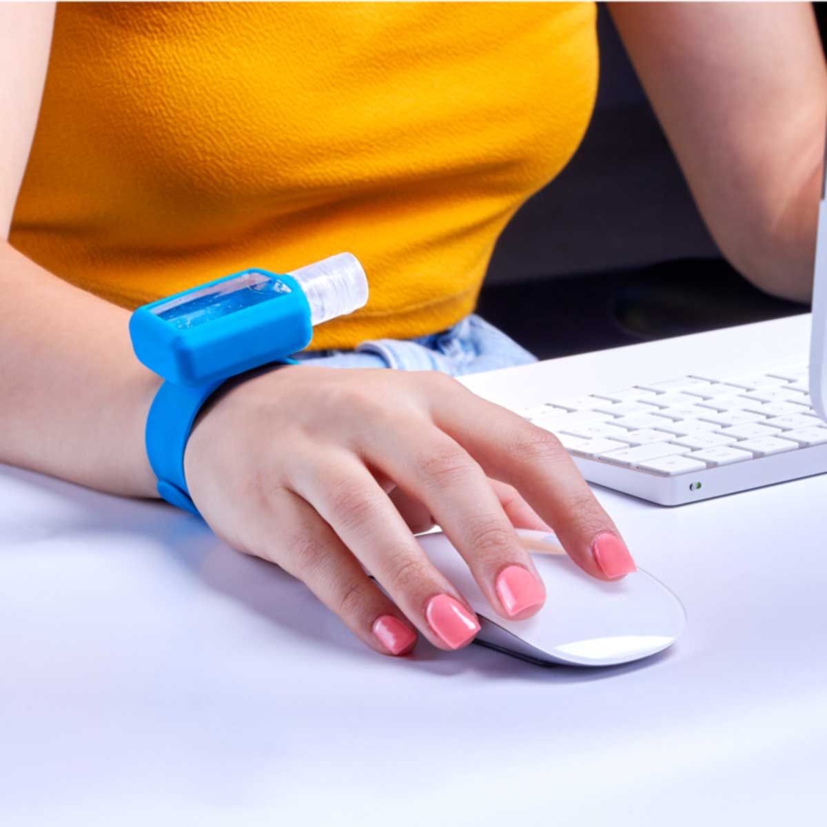 PULSERA CON GEL SANITIZANTE MILE - Pulsera de silicón con bote recargable de gel sanitizante. Se cierra al presionar contra la muñeca. Capacidad 25 ml.