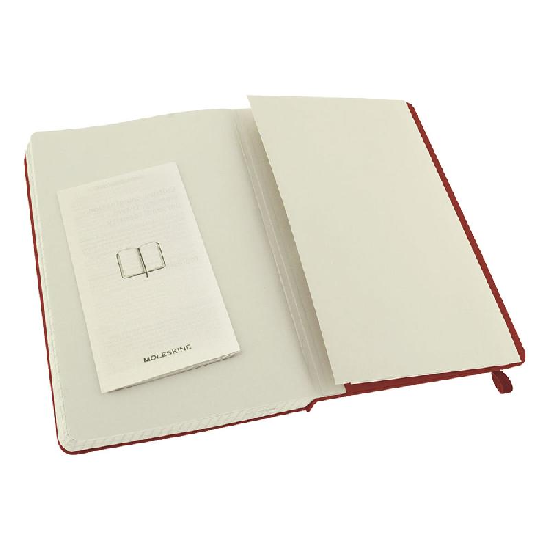 Libreta Moleskine Large. Medidas: 13 x 21 x 1.5 cm. Material: Poliuretano, tela, cartulina y papel.