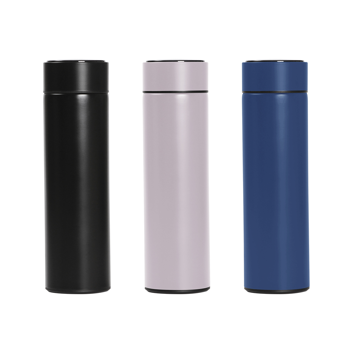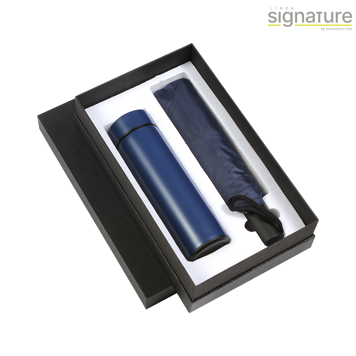 Set de regalo Jor. - Set de regalo con paraguas de poliéster con apertura automática y termo inteligente de acero inoxidable doble pared; con pantalla LED indicadora de temperatura interior en la tapa. Fabricado en materiales de grado alimenticio, mantiene bebidas frías o calientes por un largo tiempo. La batería dura hasta 2 años. No usar en microondas. Capacidad de 500 ml. Incluye caja de cartón. Cuenta con protección UV.