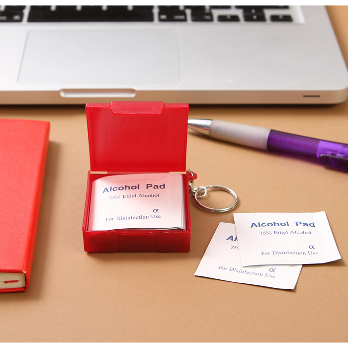 Llavero contenedor con 10 pads. - Llavero contenedor fabricado en pp, con 10 pads de non woven 6 x 6cm con alcohol al 70%.