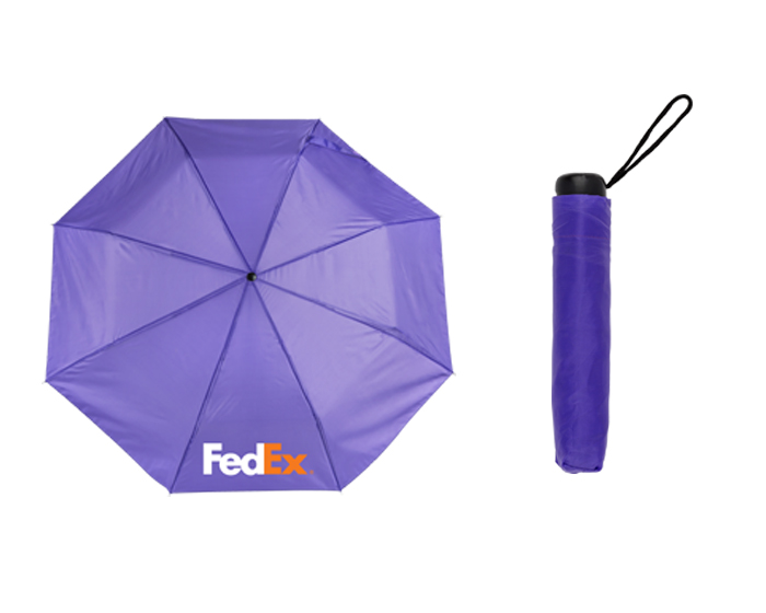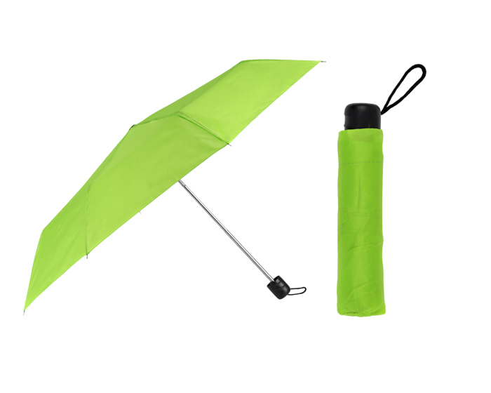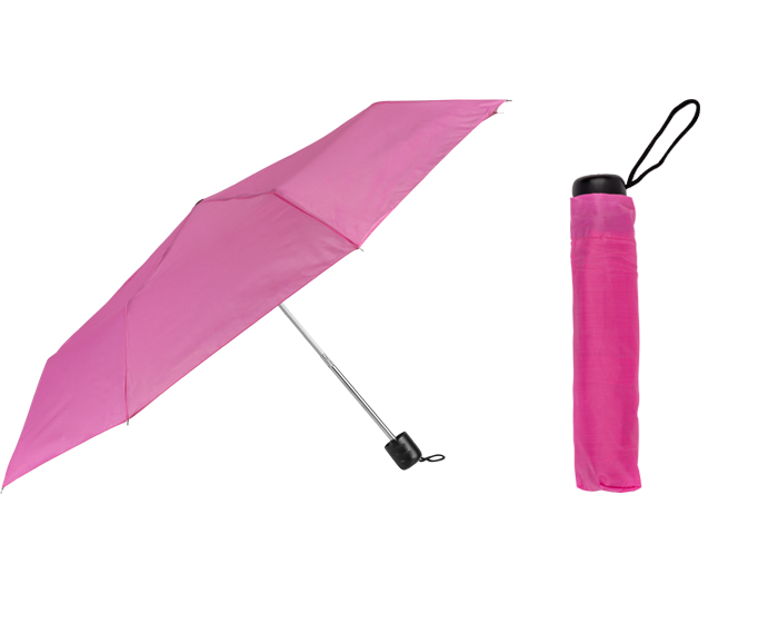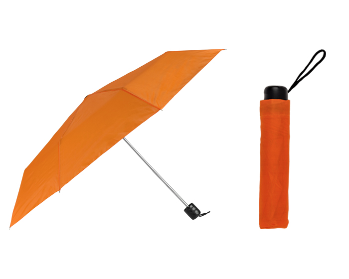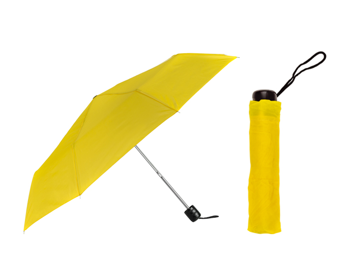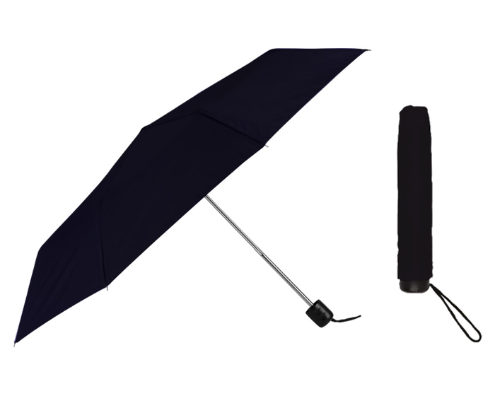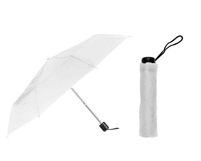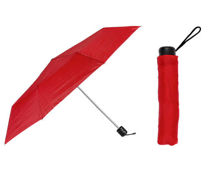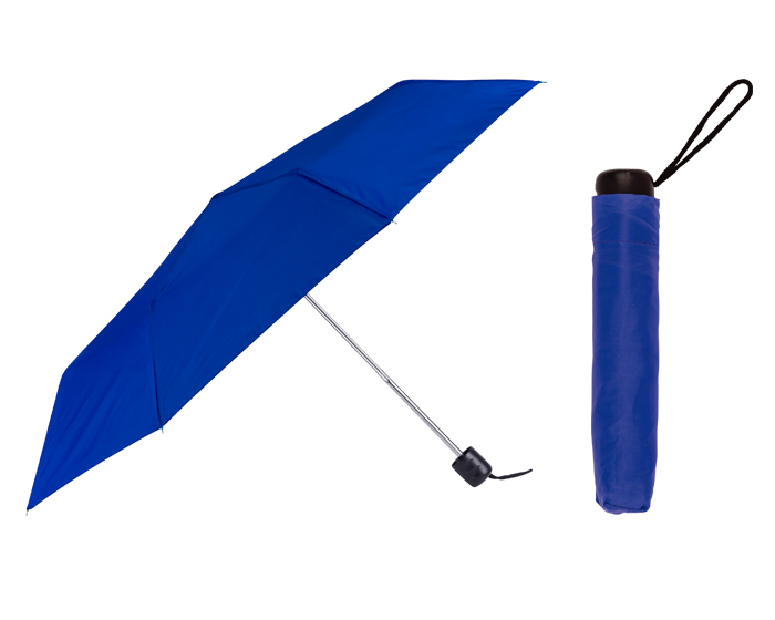 BRASILIA - Paraguas de bolsillo de 8 gajos con apertura manual y botón de cierre, varillas y eje de metal, mango de plástico y correa de cordón. Incluye funda.