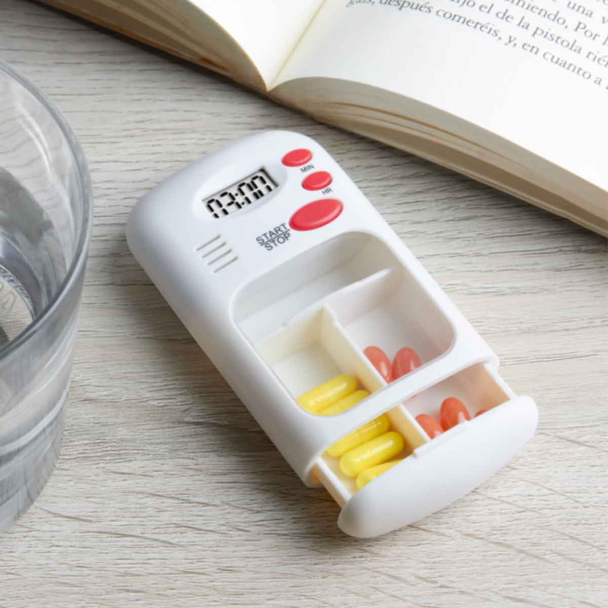 PASTILLERO HARVEY - Pastillero con alarma con múltiples repeticiones (duración de 30 segundos), programación de horas y 2 compartimientos para pastillas.