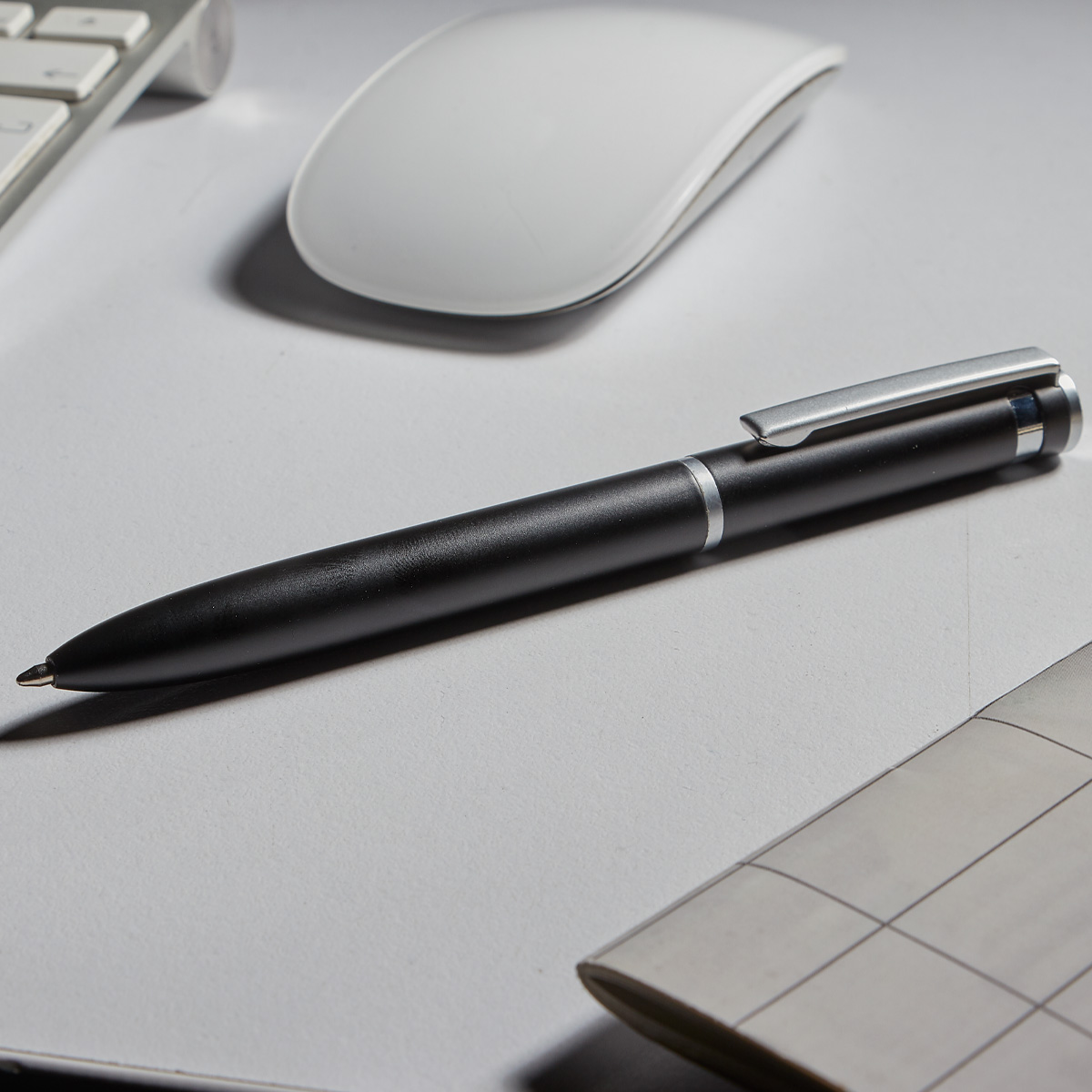 BOLÍGRAFO "BLAKE" TINTA AZUL Cuerpo color negro. Tambor superior, clip, anillo ...