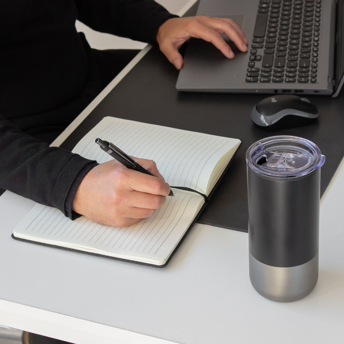 - 1 mug color negro combinado con gun en su base, de 8 x 17,6 cm. y 450 ml. Doble pared. Interior en polipropileno, exterior en acero inoxidable 201. Tapa plástica a presión con anillo de silicona.
