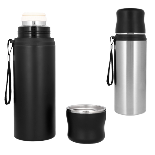 BAZUCA Termo con doble pared de acero inoxidable insulado al vacío. Incluye tapa de rosca que se utiliza como taza y una cinta ajustable para sujetarlo.