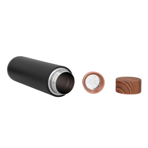 CARAMEL Termo de acero inoxidable de doble pared insulado al vacío con acabado rugoso. Incluye filtro infusor y tapa enroscable.