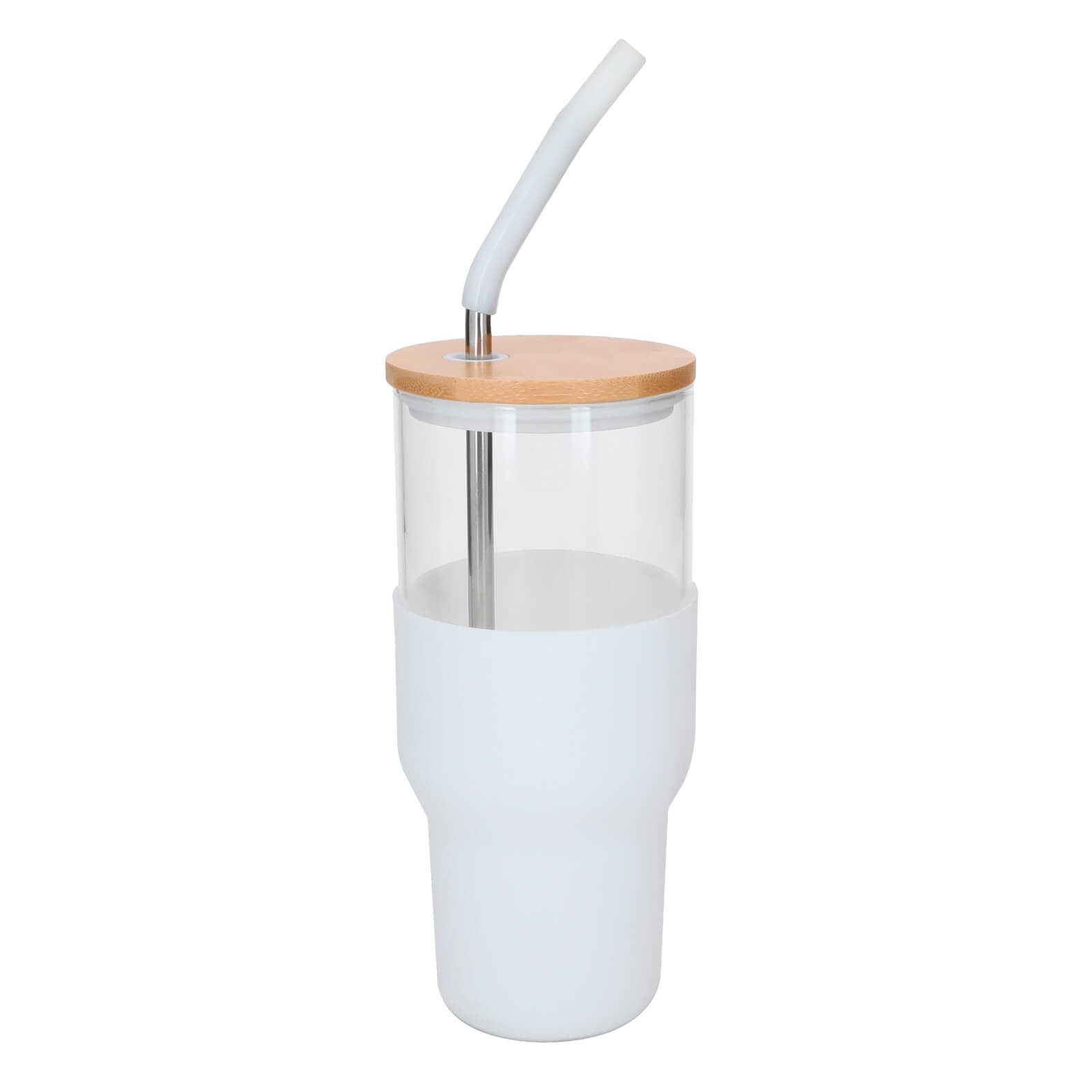 DEVAN Cilindro de vidrio con funda de silicón, tapa de bambú con cierre a presión y popote metalico con boquilla de silicón.