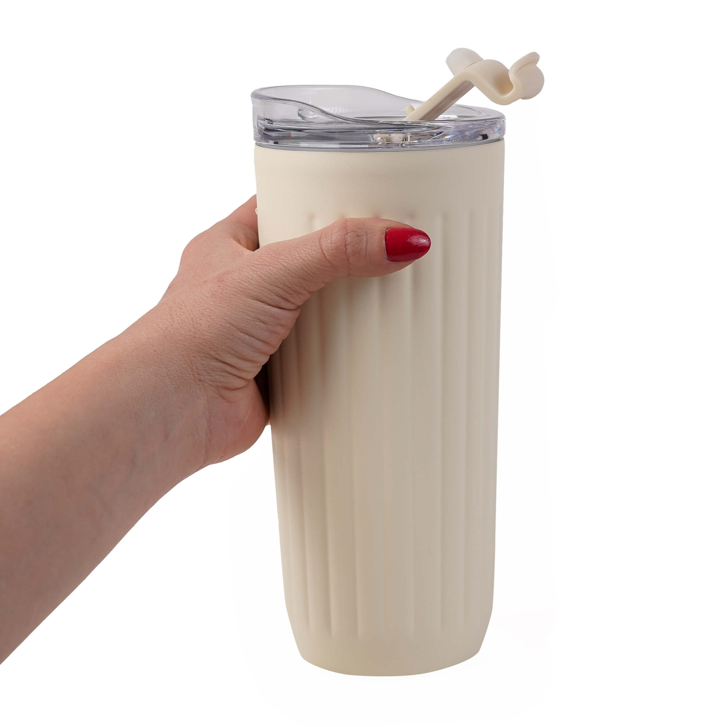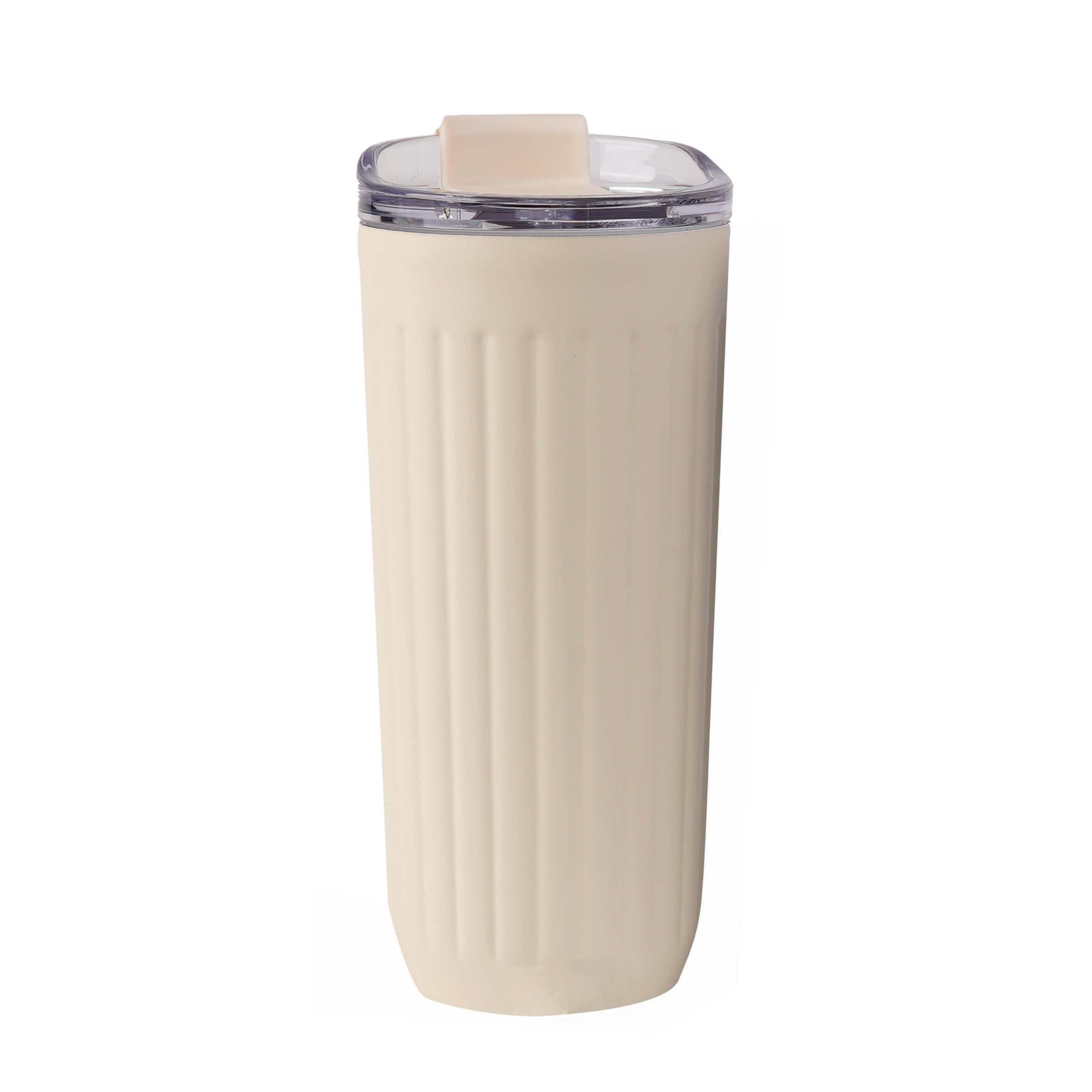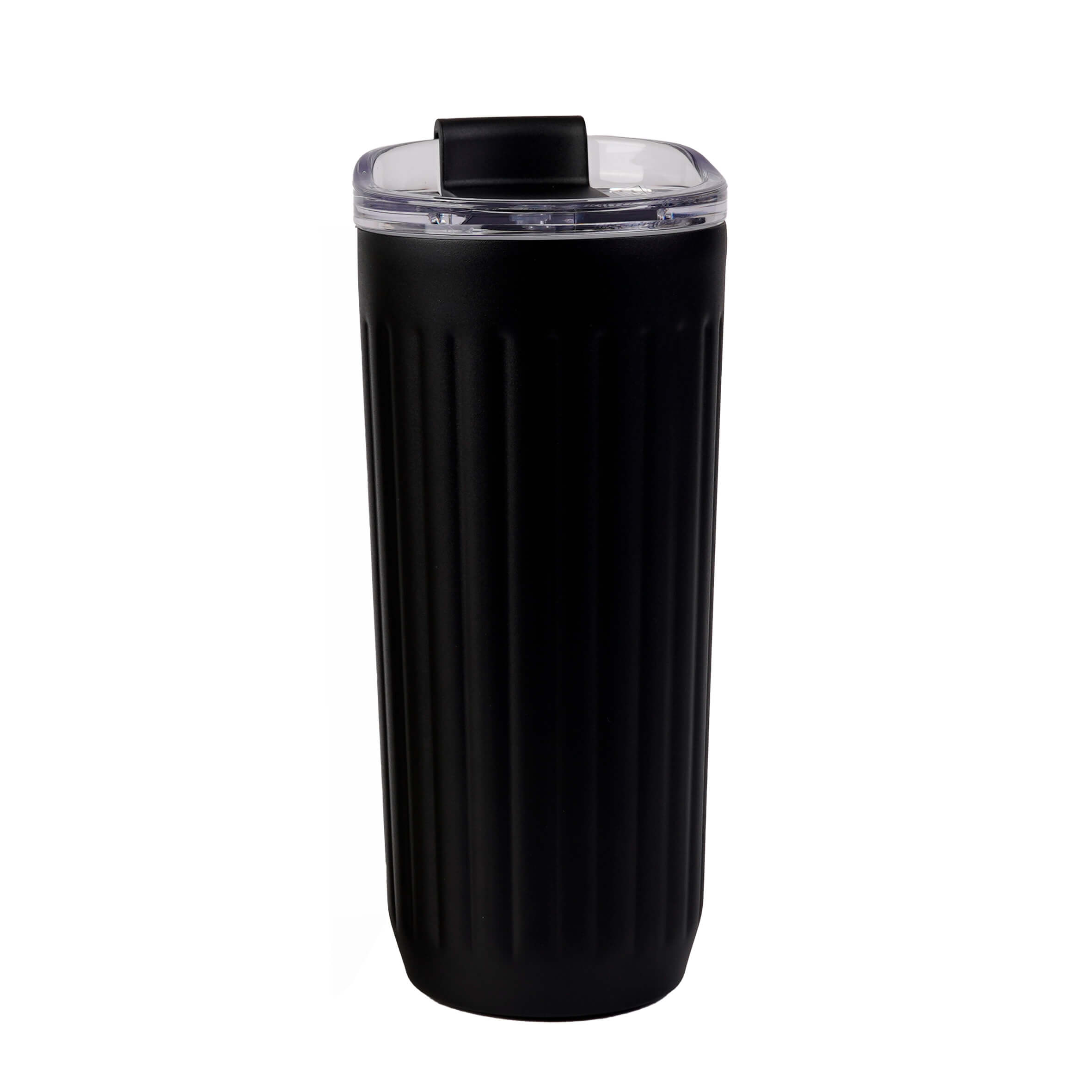 AMARETO Termo con doble pared de acero inoxidable con acabado rugoso, insaldao al vacio, tapa que cierra a presión y boquilla de seguridad.