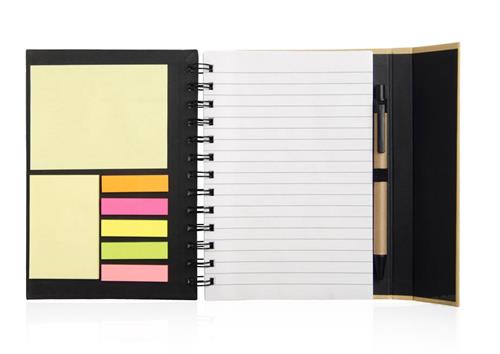 LIBRETA CON NOTAS ADHESIVAS Cuaderno de cartón con espiral. Dos autoadhesivos rectangulares (grande y mediano), cinco autoadhesivos señaladores de diferente color y bolígrafo de cartón con pulsador, clip y punta plásticos de color. 70 Hojas rayadas. Cierre imantado.