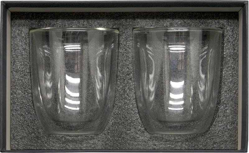 SET DE VASOS DE VIDRIO "DOUBLE" Set de vasos doble pared. Apto para bebidas frías y calientes. Presentación en caja de regalo.
