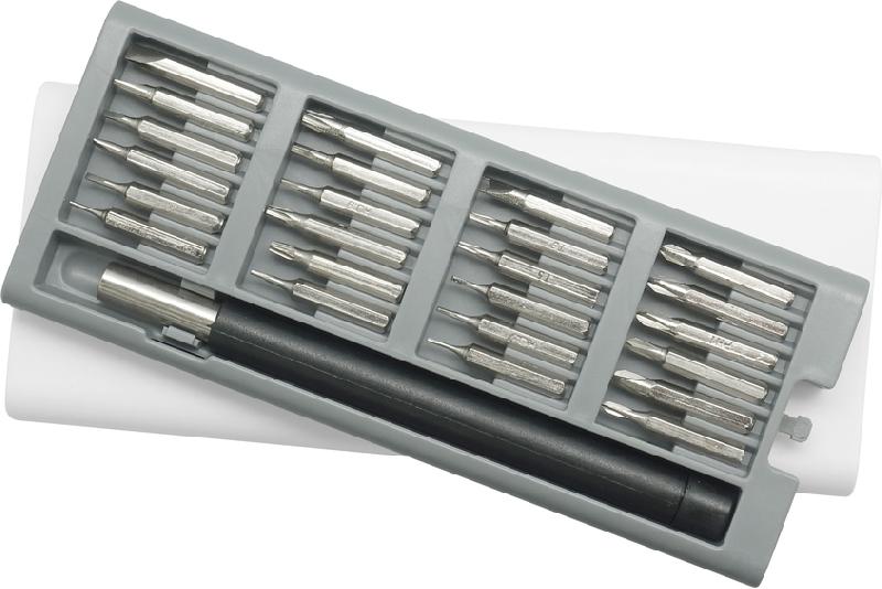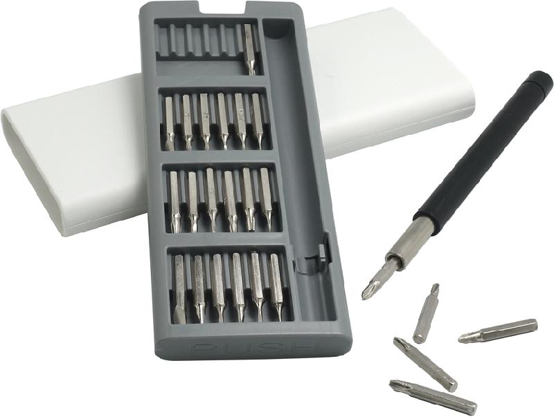 SET DE HERRAMIENTAS "CHELSEA" Mango con punta imantada con 24 puntas diferentes. La caja viene con cuatro compartimentos imantados que permiten mantener ordenadas las diferentes puntas. La caja contiene apertura push.
