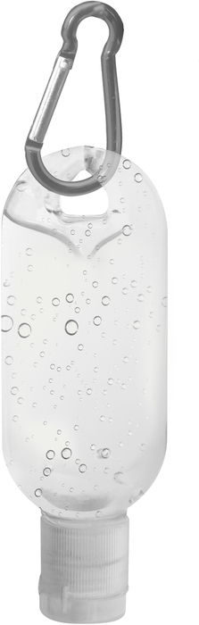 ALCOHOL EN GEL SANITIZANTE 50 ML Alcohol en gel en botella transparente con tapa y gancho carabinero de color. Fácil de usar: aplicar sobre manos, antebrazos o cualquier parte de la piel y luego frotar. Seca rápido y deja una sensación suave. Incluye etiqueta de especificaciones pegada de un lado.