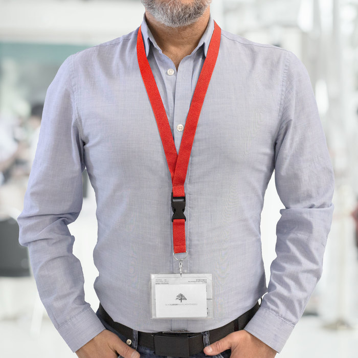MATERIAL: Poliester + PP + metal. Porta gafete MEDIDAS: 57 cm de largo x 2 cm de ancho IMPRESION: Serigrafía Tampografía