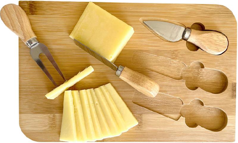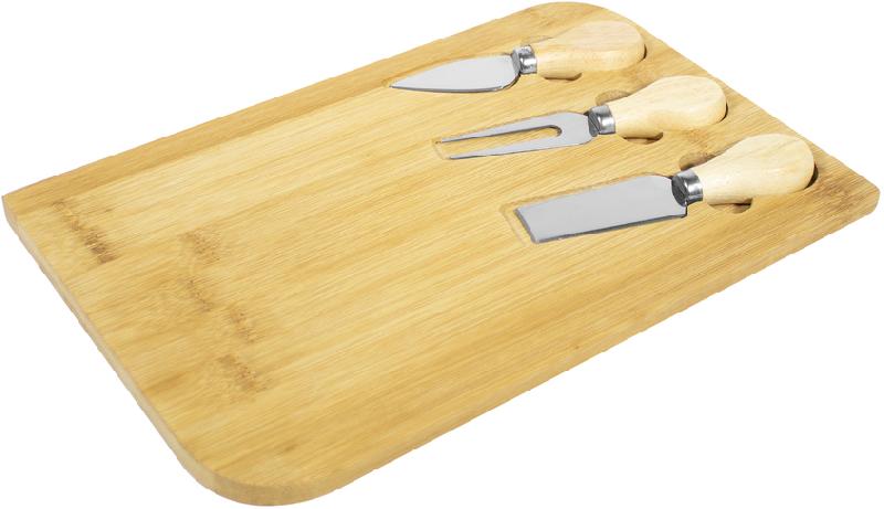TABLA PARA QUESOS "FRANCIA" Tabla de bambú con set de 3 utensilios de acero inoxidable 210 con mango de madera: 2 cuchillos y 1 tenedor. Tabla para cortar y presentar diferentes quesos acompañada de un buen vino tinto en tus próximas reuniones. Presentación en caja de regalo.