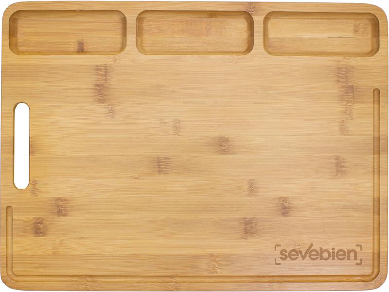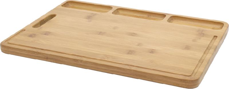 TABLA DE CORTE "BAMBOARD" Tabla de corte en Bambú. Tres compartimentos para armar botanas y llevarlas directo a la mesa. Transportable con manija incluida. Presentación en caja de regalo.