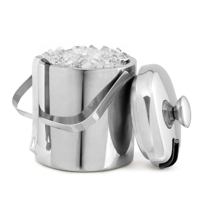 Hielera " ALASKA" Capacidad 1100 ml. Acero inoxidable. Interior en acero 304 y exterior en acero 201. Hielera de mesa con tapa. Pinza para hielo de acero inoxidable, encastrable en la misma tapa. Asa de acero inoxidable para transportar. Presentación en caja de regalo kraft.