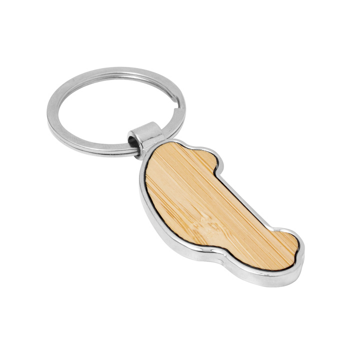 Llavero "KICAR" Llavero con forma de auto. Estructura metálica con aleación de zinc con acabado brillante y panel frontal de bambú barnizado.