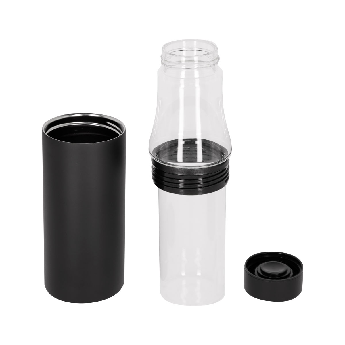 TERMO CON VIDRIO KAAP - Termo de vidrio doble pared con base exterior de acero inoxidable desprendible. Cerrado al vacío para conservar el frío o calor de la bebida. Tapa de metal de rosca. La base desprendible puede ser utilizada como vaso. Incluye caja individual.