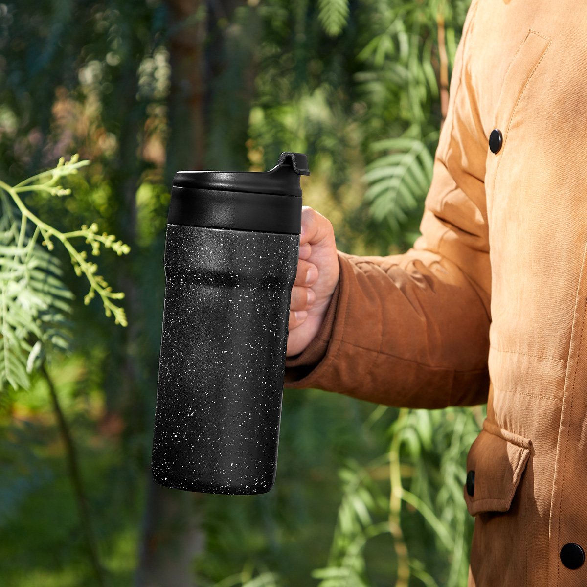 TERMO DOTS - Doble pared. Cerrado al vacío. Pared interna y externa de acero inoxidable. Tapa de plástico con cierre de rosca y sobretapa con sistema push. Mantiene temperaturas caliente y fría 6 hrs aproximadamente. Efecto brisado. El terminado no es uniforme y puede variar por la técnica de producción. Incluye caja individual.