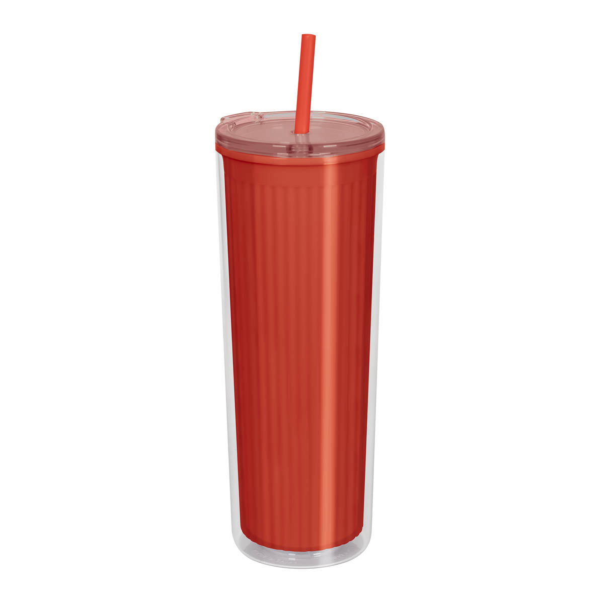 VASO NELI - Termo de plástico doble pared. Pared interna de color, texturizada a rayas, y pared externa lisa y transparente que, en conjunto, ofrecen un diseño moderno y vibrante. Incluye tapa de plástico con sistema push y popote a juego. Capacidad de 22 Oz. Base de 7.5 cm de diámetro. Incluye caja individual.