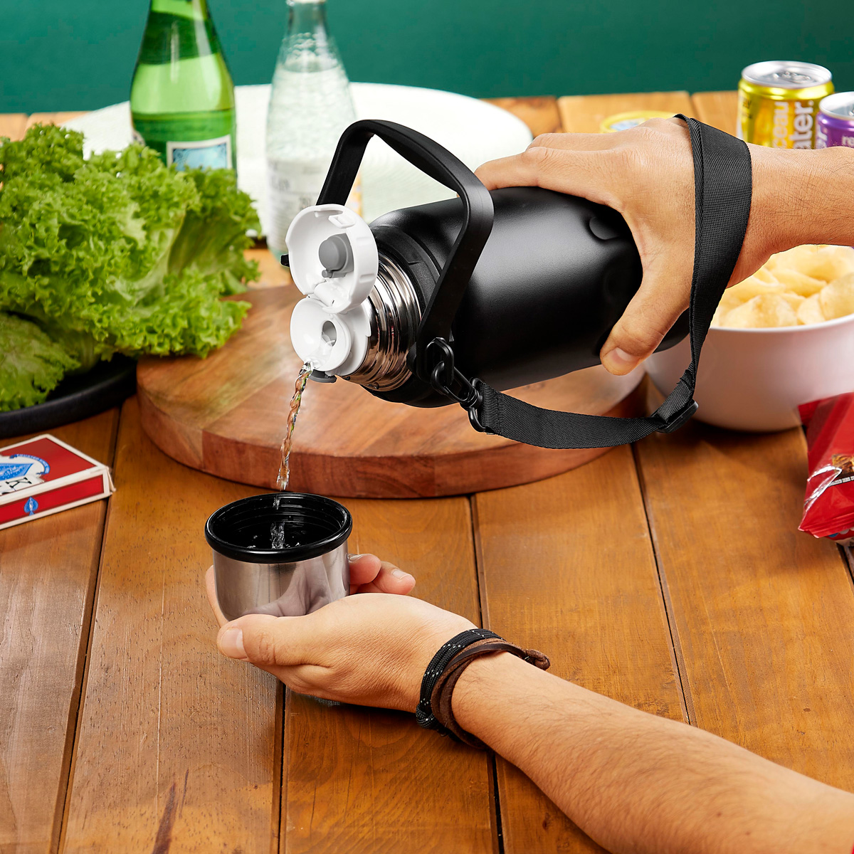 TERMO LANK - Termo doble pared. Cerrado al vacío. Pared interna y externa acero inoxidable y cuerpo con terminado tipo rugoso. Tapa de plástico con sistema de rosca, boquilla y botón de seguridad para mantener cerrado y sin derrames, incluye sobretapa metálica de rosca. Además, agrega un asa plegable de plástico y un asa de poliéster removible, que facilita su traslado. Mantiene la temperatura caliente por 10 hrs y la temperatura fría por 12 hrs. Capacidad de 40 Oz. Incluye caja individual.
