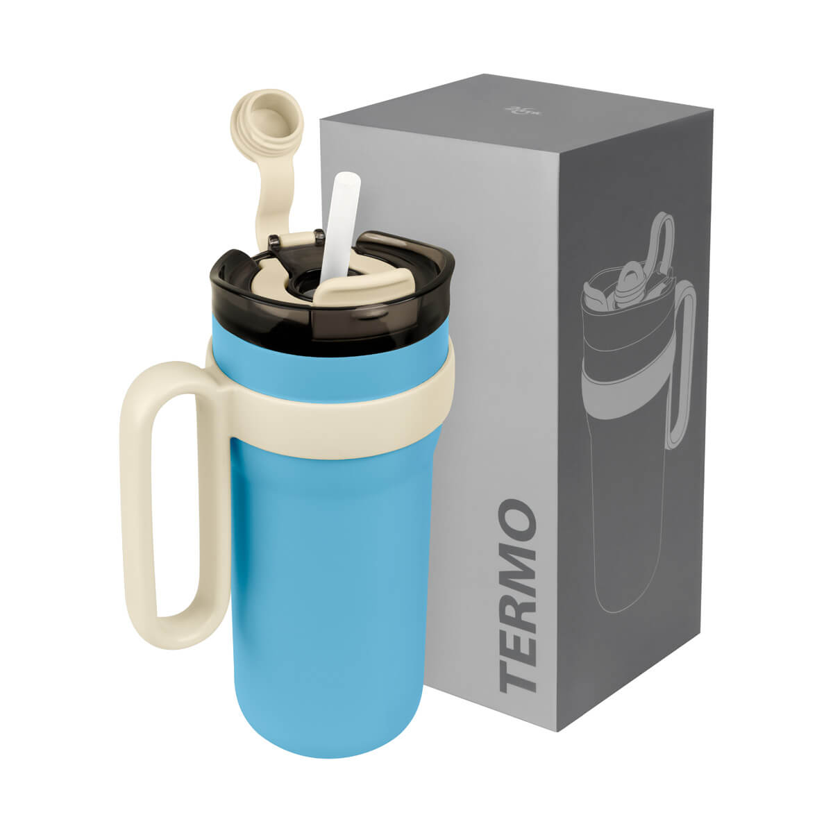 TERMO RANTAI - Termo doble pared. Cerrado al vacío. Pared interna y externa de acero inoxidable. Cuerpo con terminado rugoso. Incluye tapa con cierre de rosca que ofrece dos alternativas de uso, sobretapa con sistema push y ranura especial para popote con aditamento para cerrar y evitar derrames. Incluye popote de plástico que cuenta con un mecanismo de salida automática y una base de silicón, que lo eleva al abrir el compartimento. Además, su original asa permite llevarlo cómodamente a cualquier lugar. Mantiene temperatura caliente 6 hrs y temperatura fría 8 hrs. Capacidad 30 Oz. Base de 8.5 cm de diámetro. Incluye caja individual.