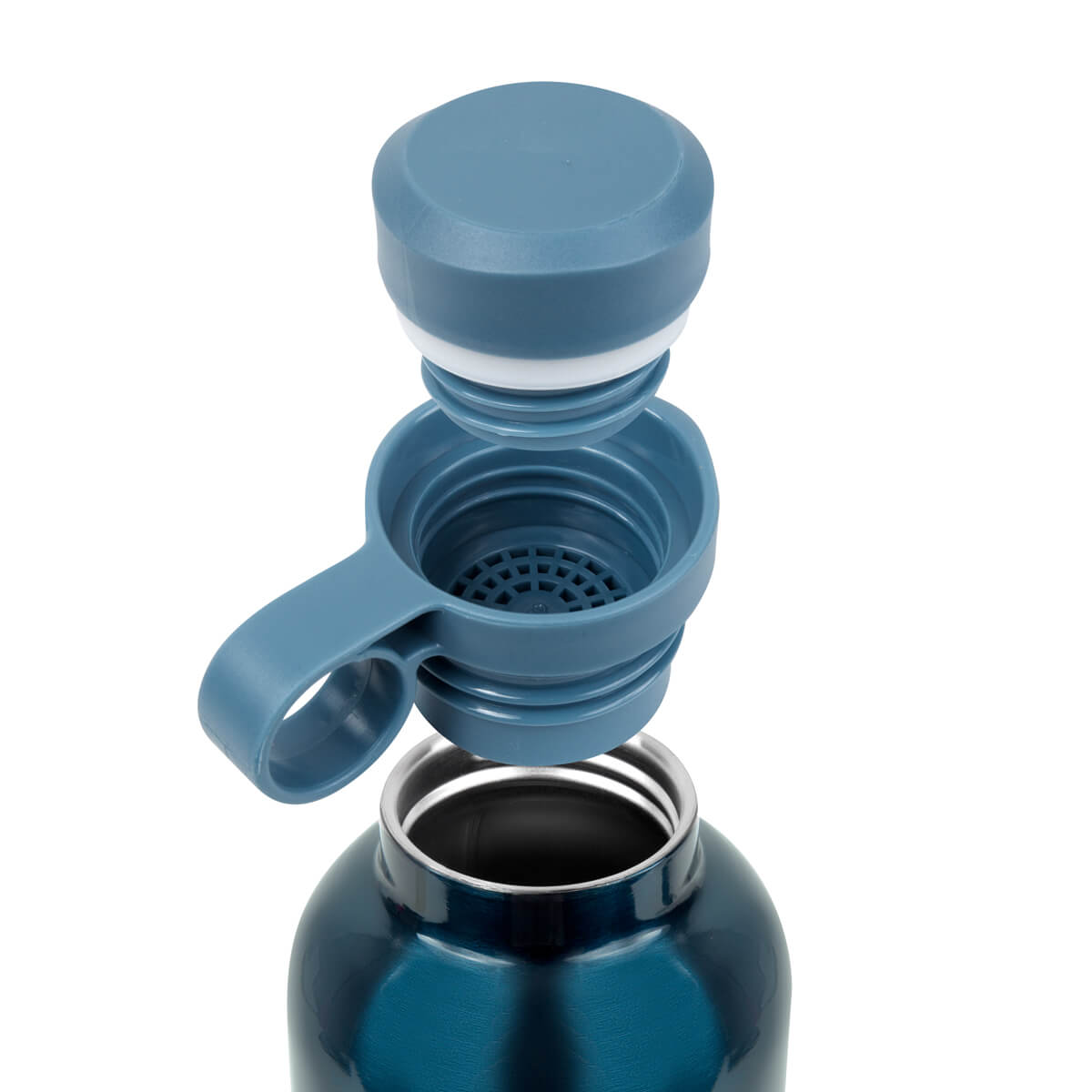 TERMO FAINNE - Termo doble pared, cerrado al vacío. Pared interna y externa de acero inoxidable. Incluye tapa de plástico con doble sistema de rosca, además de incorporar un filtro para preparar té o infusiones. Su asa integrada facilitará que los lleves a todos lados, además su acabado brillante y colores metalizados le dan un toque sofisticado, ideal para la oficina, el gimnasio o cualquier aventura. Mantiene temperatura caliente 6 hrs y temperatura fría 12 hrs. Capacidad 22 Oz. Incluye individual.