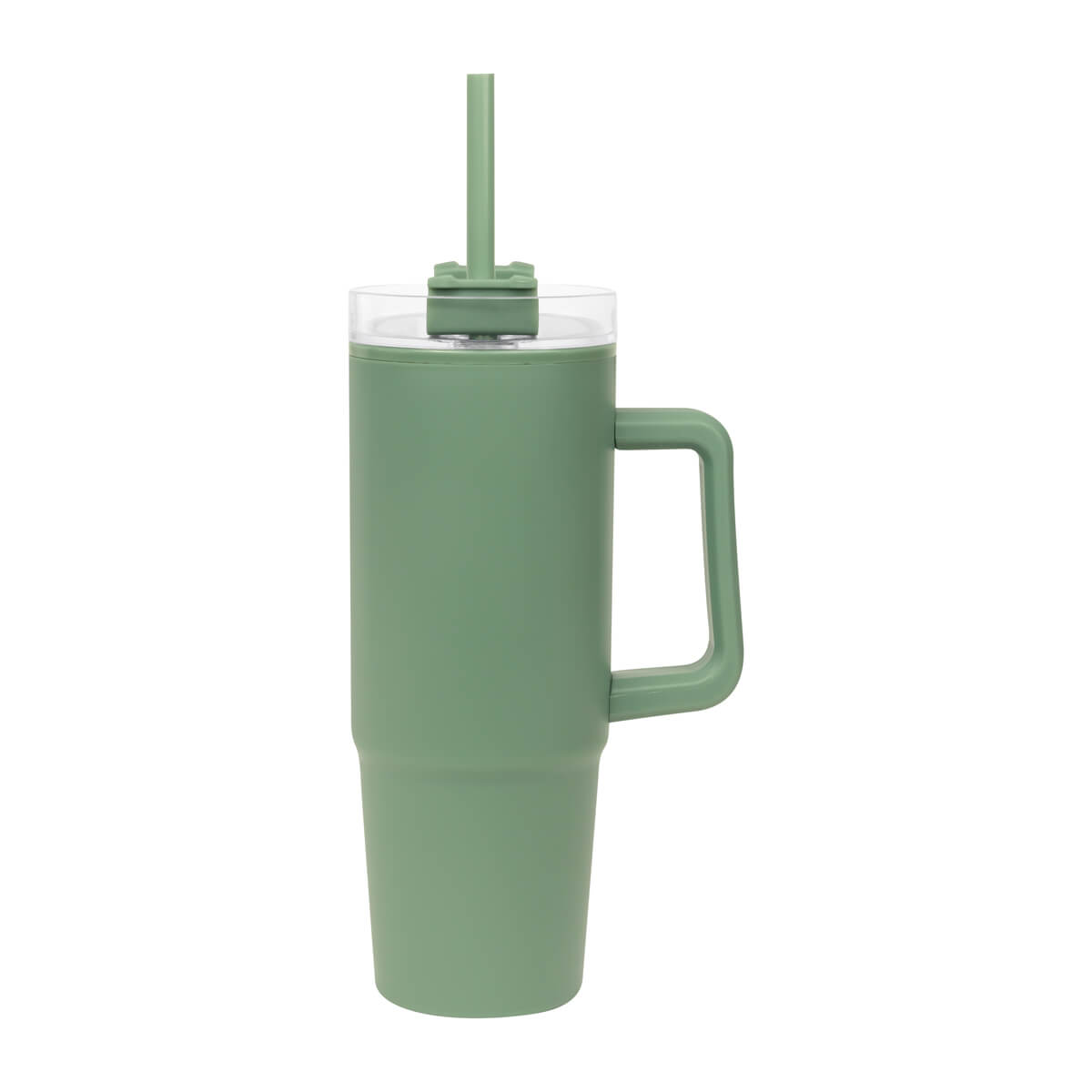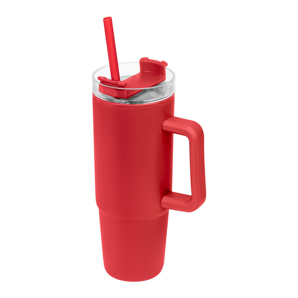 TERMO EDAN - De doble pared. Pared interna y externa de plástico. Tapa de plástico con cierre de rosca. Sobre tapa giratoria de plástico con opción para beber con popote o boquilla tradicional. Capacidad de 30 Oz. Base de 7 cm de diámetro. Incluye popote de plástico y caja individual.