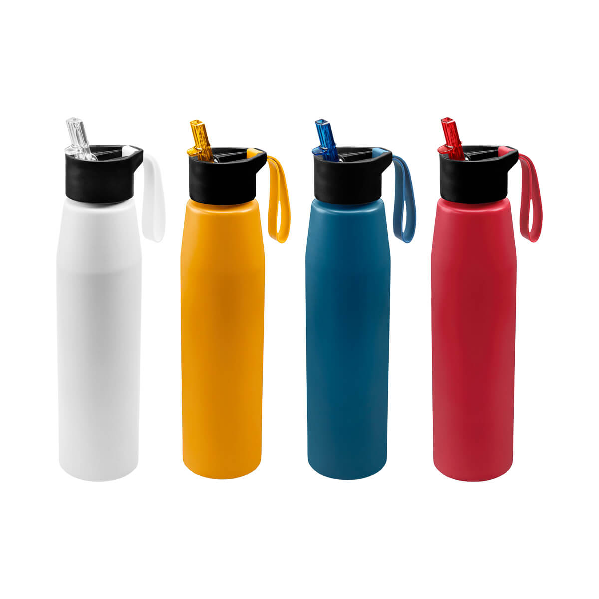 CILINDRO TONDO - Cilindro metálico de una pared. Incluye tapa de plástico con sistema de rosca para un cierre hermético y seguro, cuenta con una boquilla plegable para beber sin riesgo de derrames, incluso estando en movimiento. Incluye popote de plástico. La tapa incluye también un asa de silicón, que permite transportarlo fácilmente a cualquier parte. Capacidad de 25 Oz. Incluye caja individual.