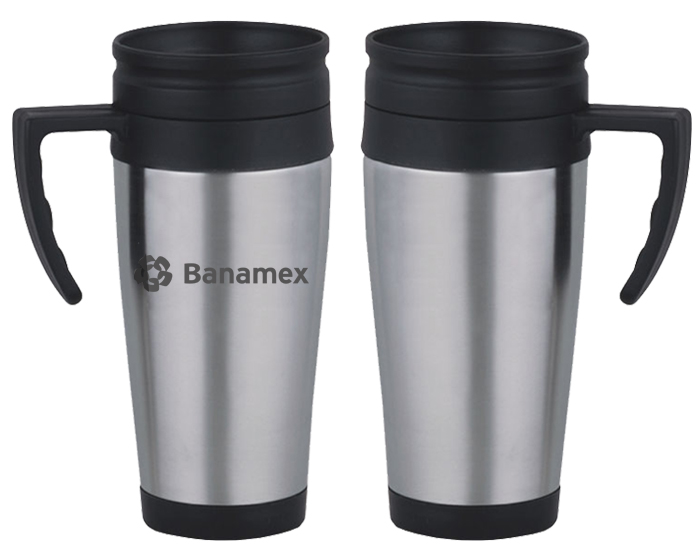 MATERIAL: Termo: Exterior Acero inoxidable / Interior y asa: Plástico MEDIDAS: Ø 8 x 18 cm IMPRESION: TM GL MED. EMPAQUE: 52 x 29 x 40 cm PESO EMPAQUE: 6.5 kg PIEZAS EMPAQUE: 24