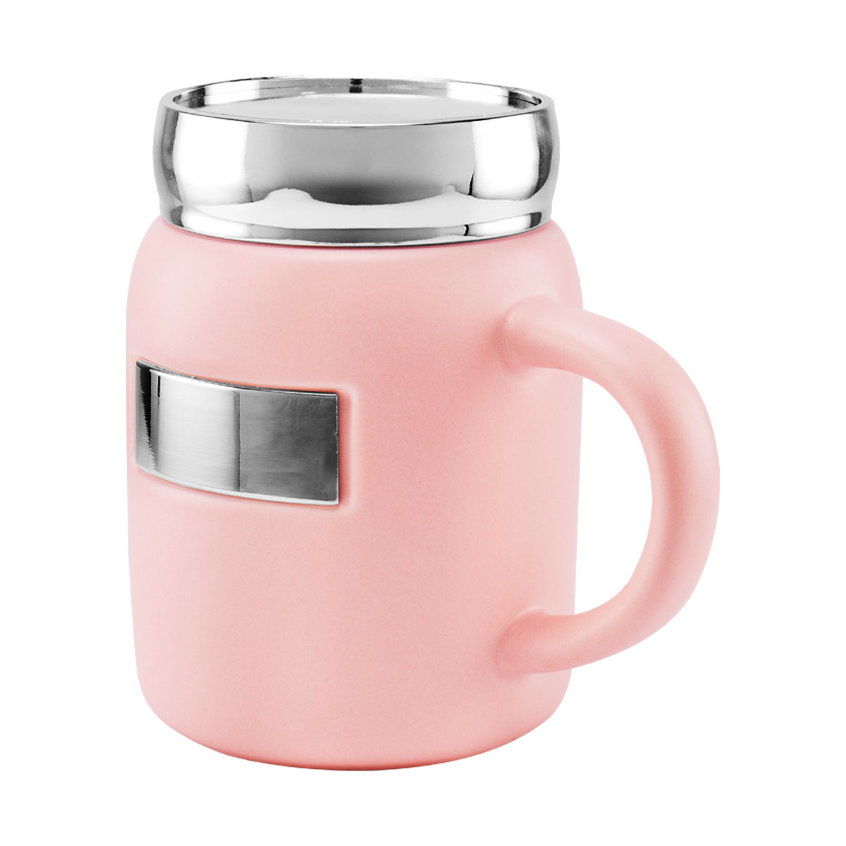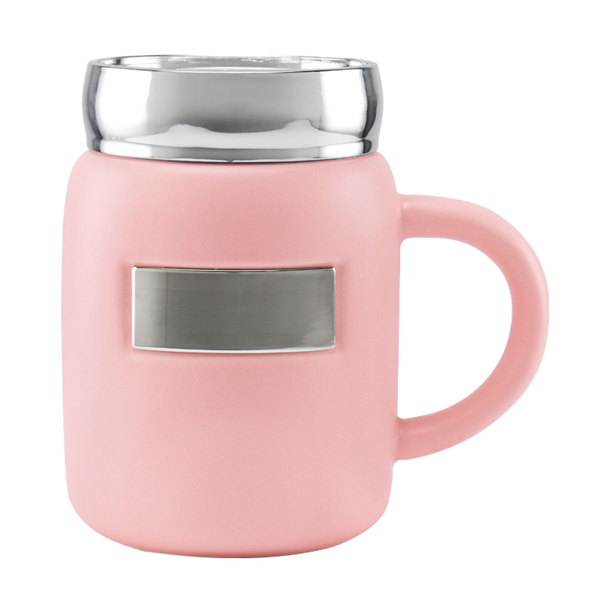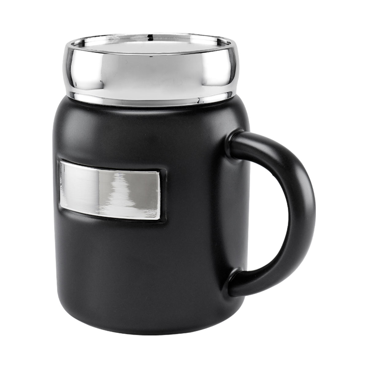 TAZA ILMA - Taza tarro de cerámica con placa metálica para impresión. Tapa de rosca de plástico con recubrimiento metalizado. Terminado mate. Incluye caja individual.