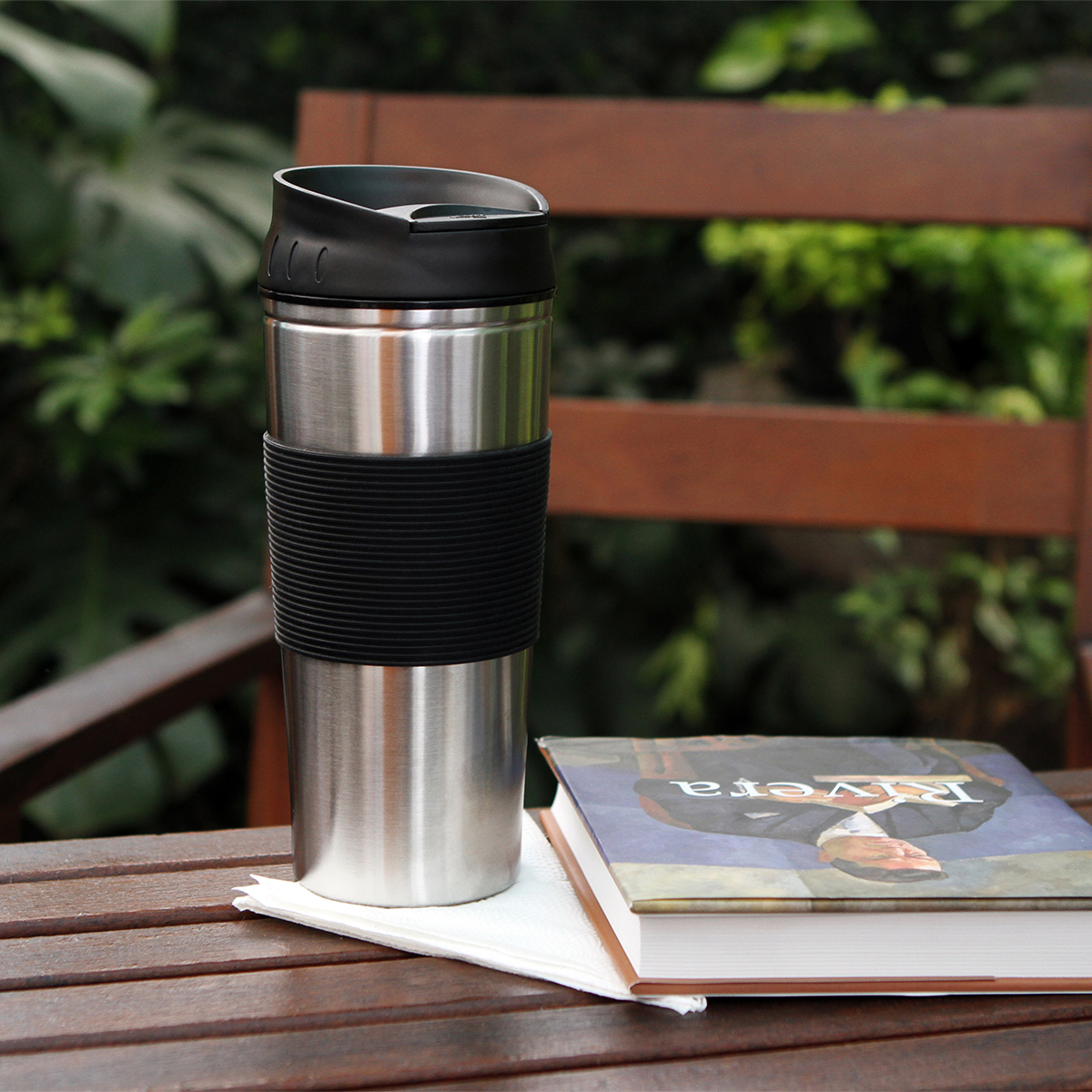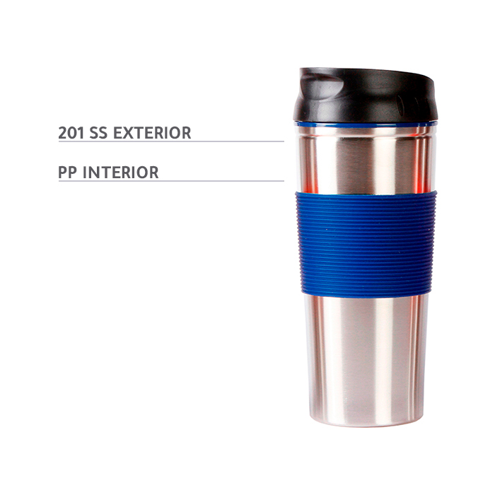 Termo Luanda. - Termo de acero inoxidable con manga de silicón y tapa deslizable, fabricado en materiales de grado alimenticio, no usar en microondas. Capacidad 500 ml (17oz).