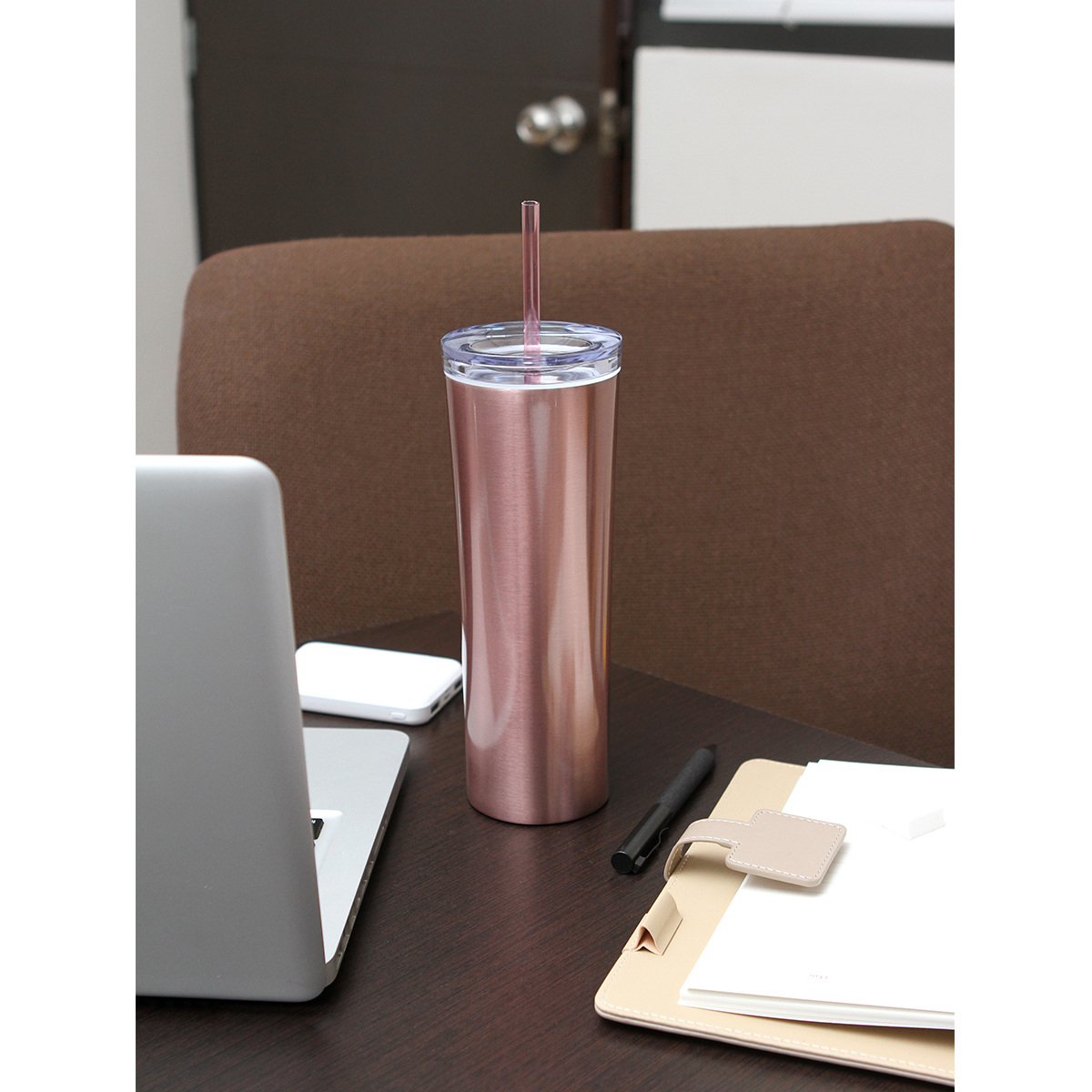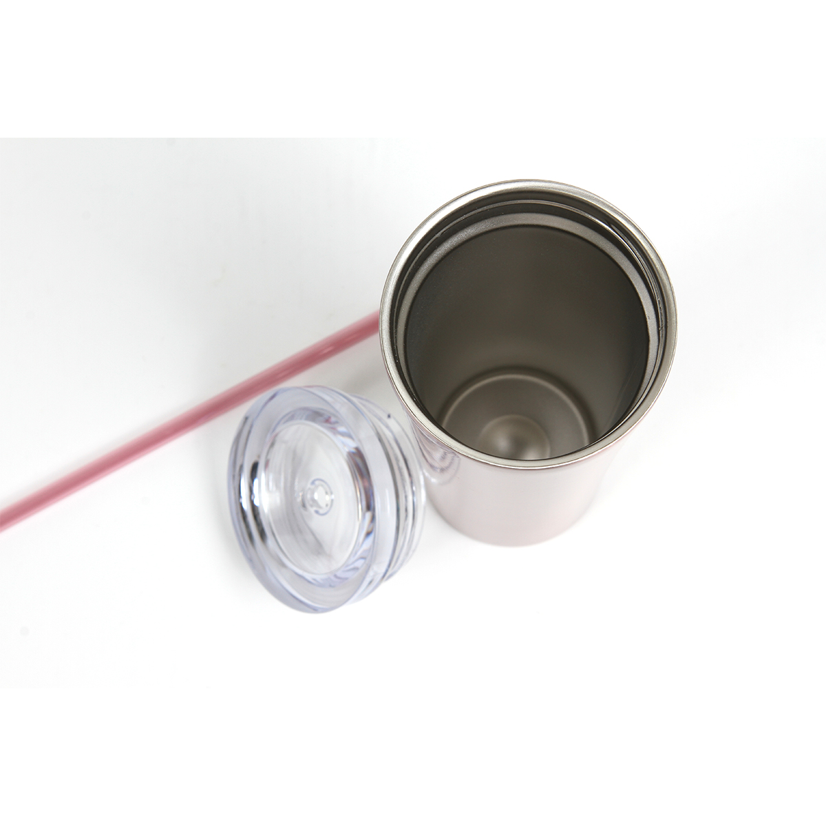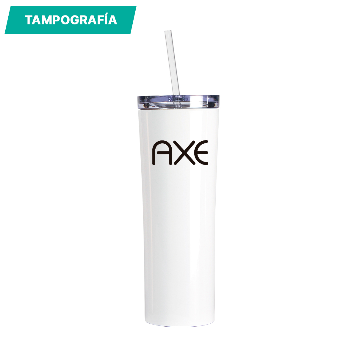 Termo Gomba. - Termo de acero inoxidable doble pared con tapa de plástico transparente y popote, fabricado en materiales de grado alimenticio, mantiene bebidas frías o calientes por un largo tiempo, no usar en microondas. Capacidad 470 ml (16oz). Incluye caja de cartón individual.