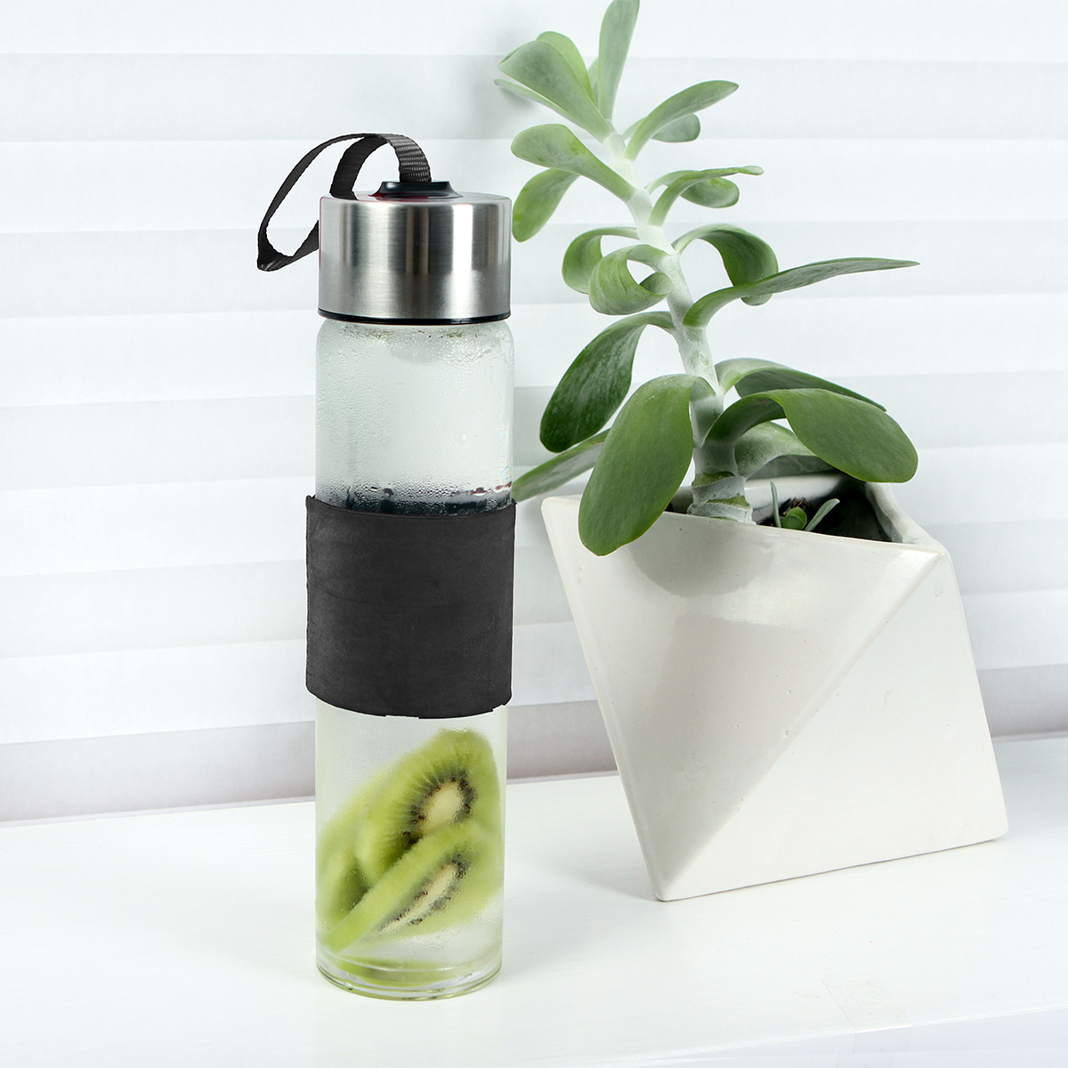 Cilindro Ulmi. - Cilindro de cristal de borosilicato con tapa metálica de cierre hermético, correa y manga de poliuretano (PU), fabricado en materiales de grado alimenticio, capacidad 450 ml (15 oz). Incluye caja de cartón individual.