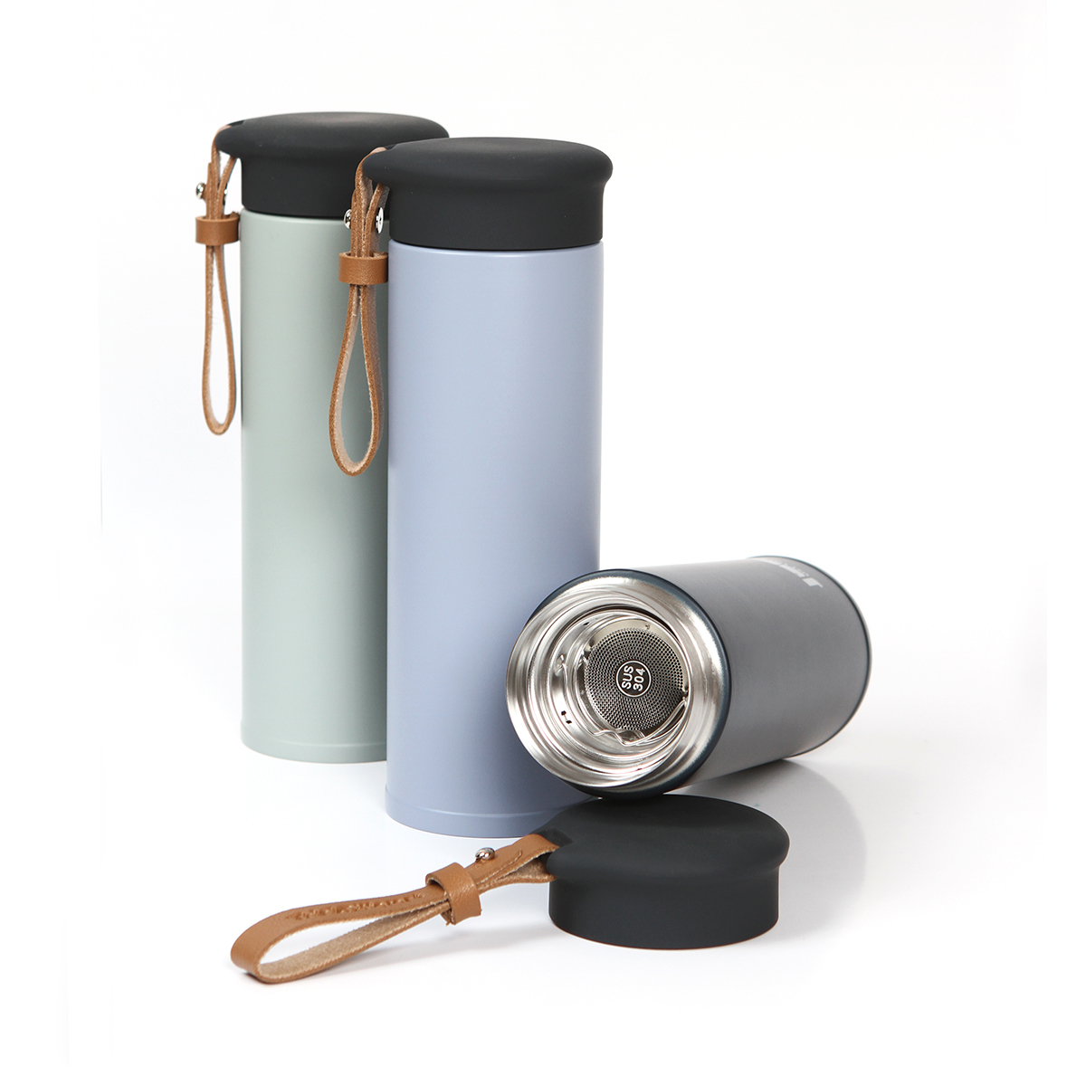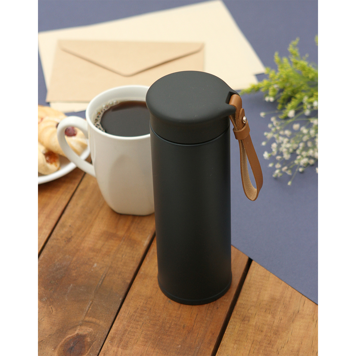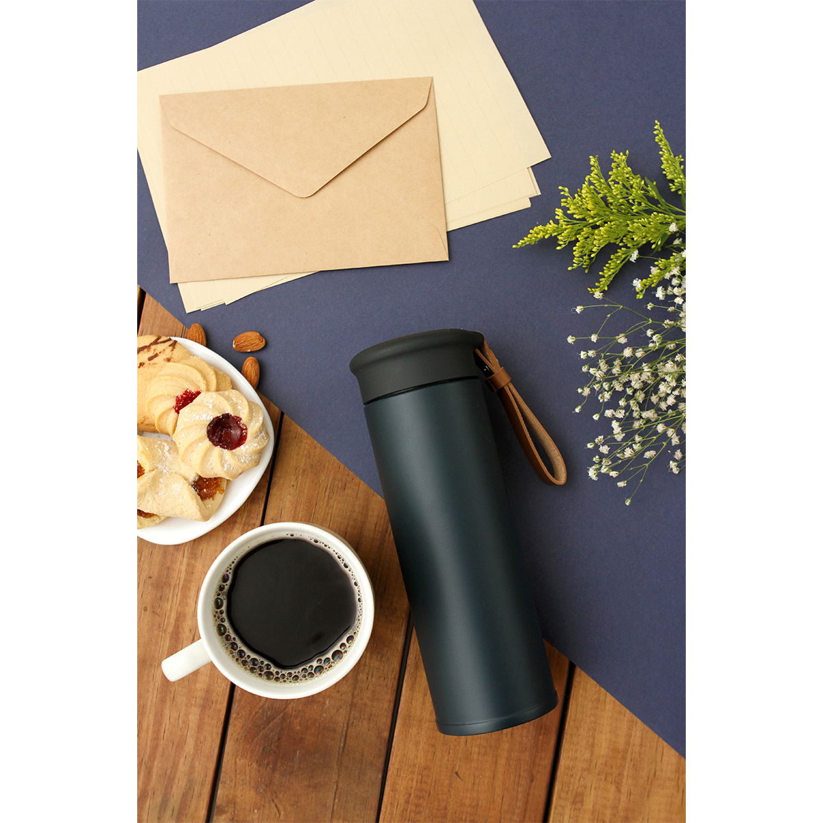 Termo Legazpi. - Termo de acero inoxidable con doble pared, tapa de Acrilonitrilo Butadieno Estireno (ABS), rejilla para té y correa de piel. Fabricado en materiales de grado alimenticio, mantiene bebidas frías o calientes por un largo tiempo, no usar en microondas. Capacidad 450 ml. Incluye caja de cartón individual
