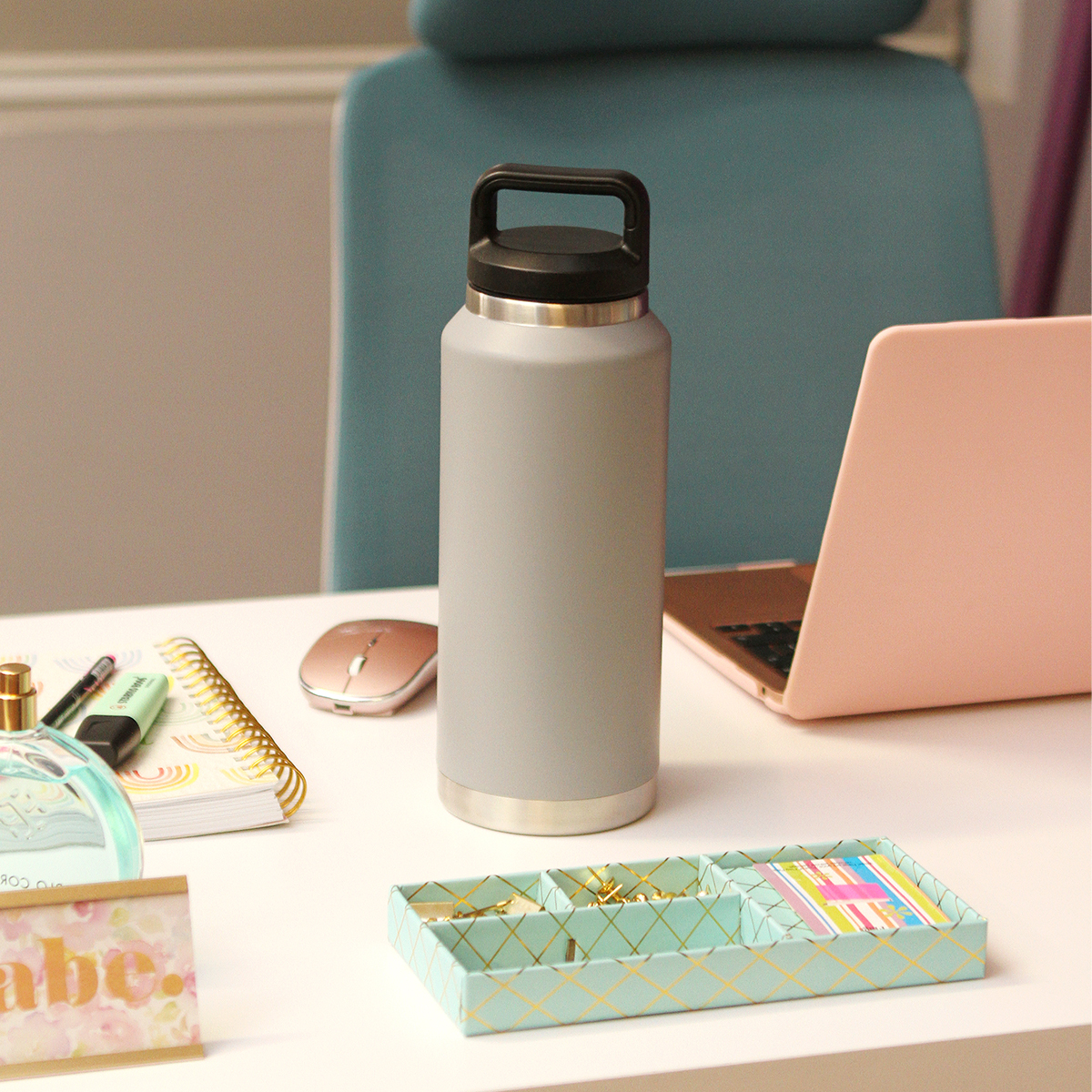 Termo Leópolis. 1 LT. - Termo de acero inoxidable doble pared con tapa de rosca y agarradera, detalles plata en base y boquilla. Fabricado en materiales de grado alimenticio, mantiene bebidas frías o calientes por un largo tiempo. No usar en microondas. Capacidad de 1000 ml. Incluye caja de cartón individual.