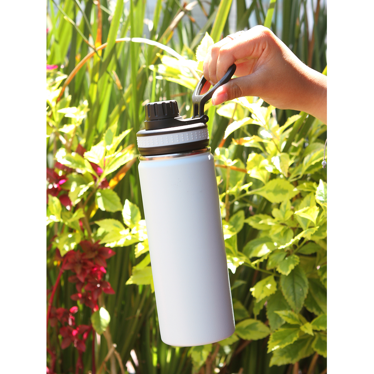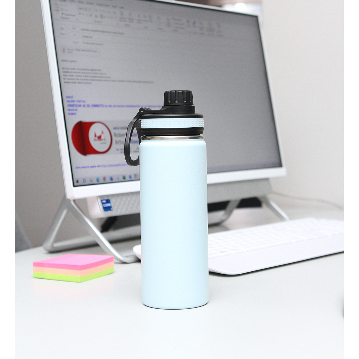 Termo Ruwais. - Termo de acero inoxidable doble pared acabado mate, tapa de rosca con boquilla y asa de plástico. Fabricado en materiales de grado alimenticio, mantiene bebidas frías o calientes por un largo tiempo. No usar en microondas. Capacidad de 500 ml. Incluye caja de cartón individual.