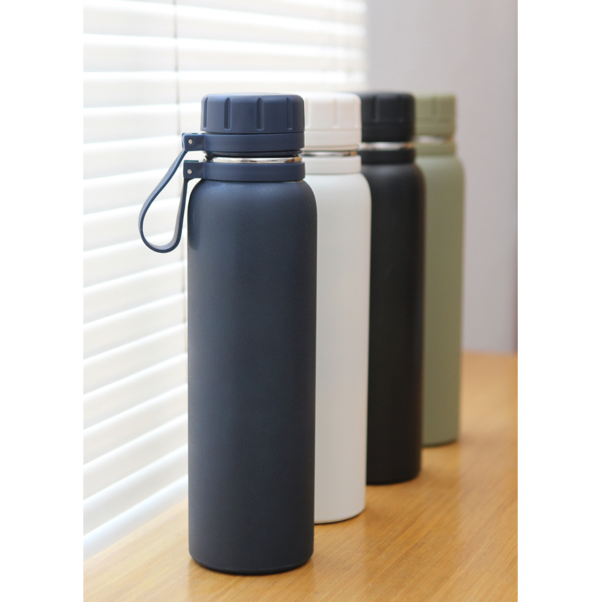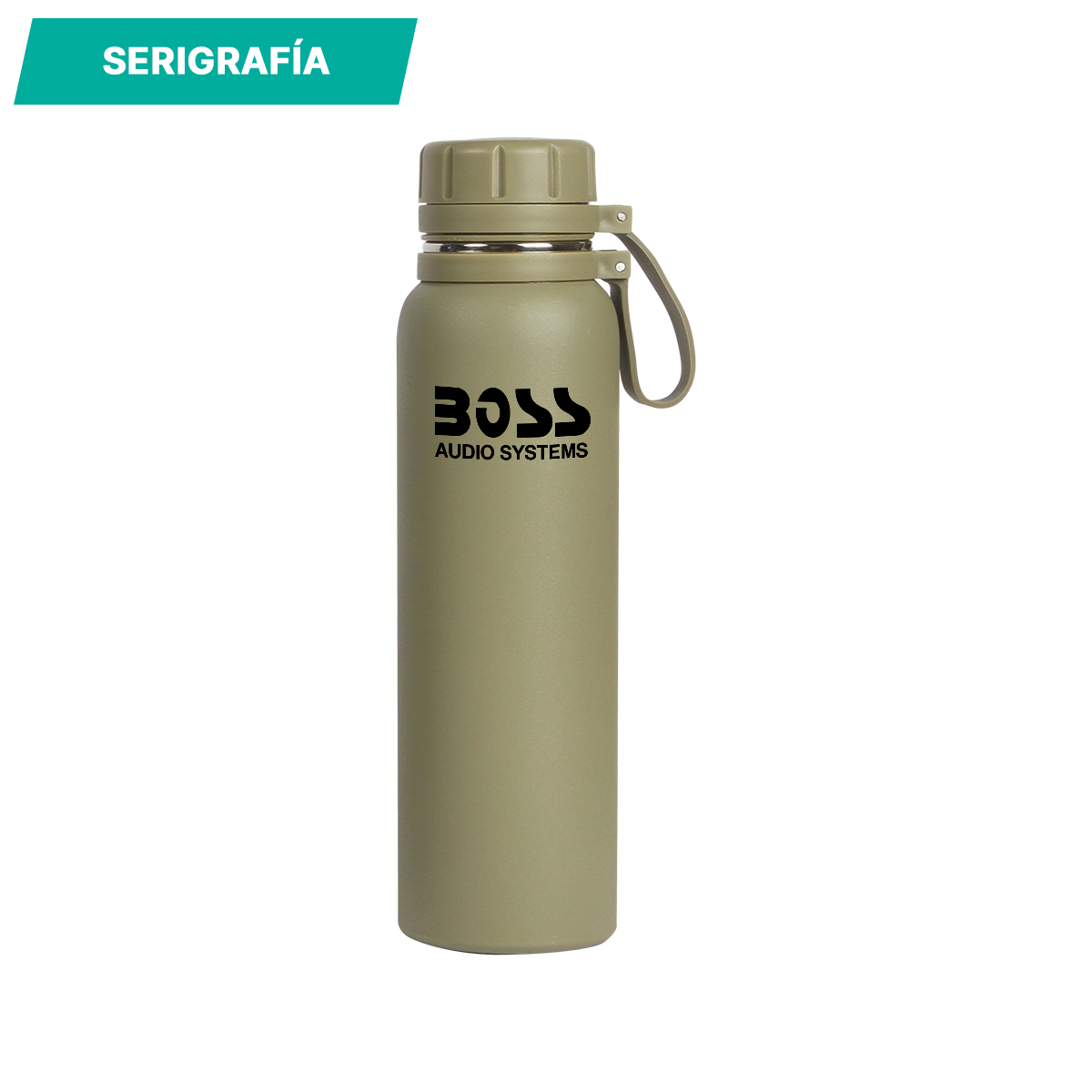 Termo Rayán. - Termo de acero inoxidable doble pared acabado brillante, con tapa de plástico y correa de silicón. Fabricado en materiales de grado alimenticio, mantiene bebidas frías o calientes por un largo tiempo. No usar en microondas. Capacidad de 850 ml. Incluye caja de cartón individual.