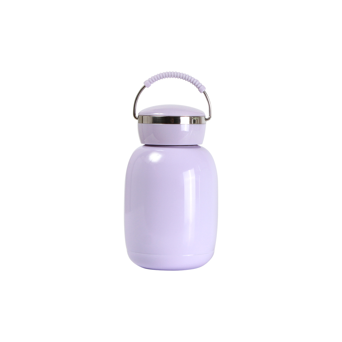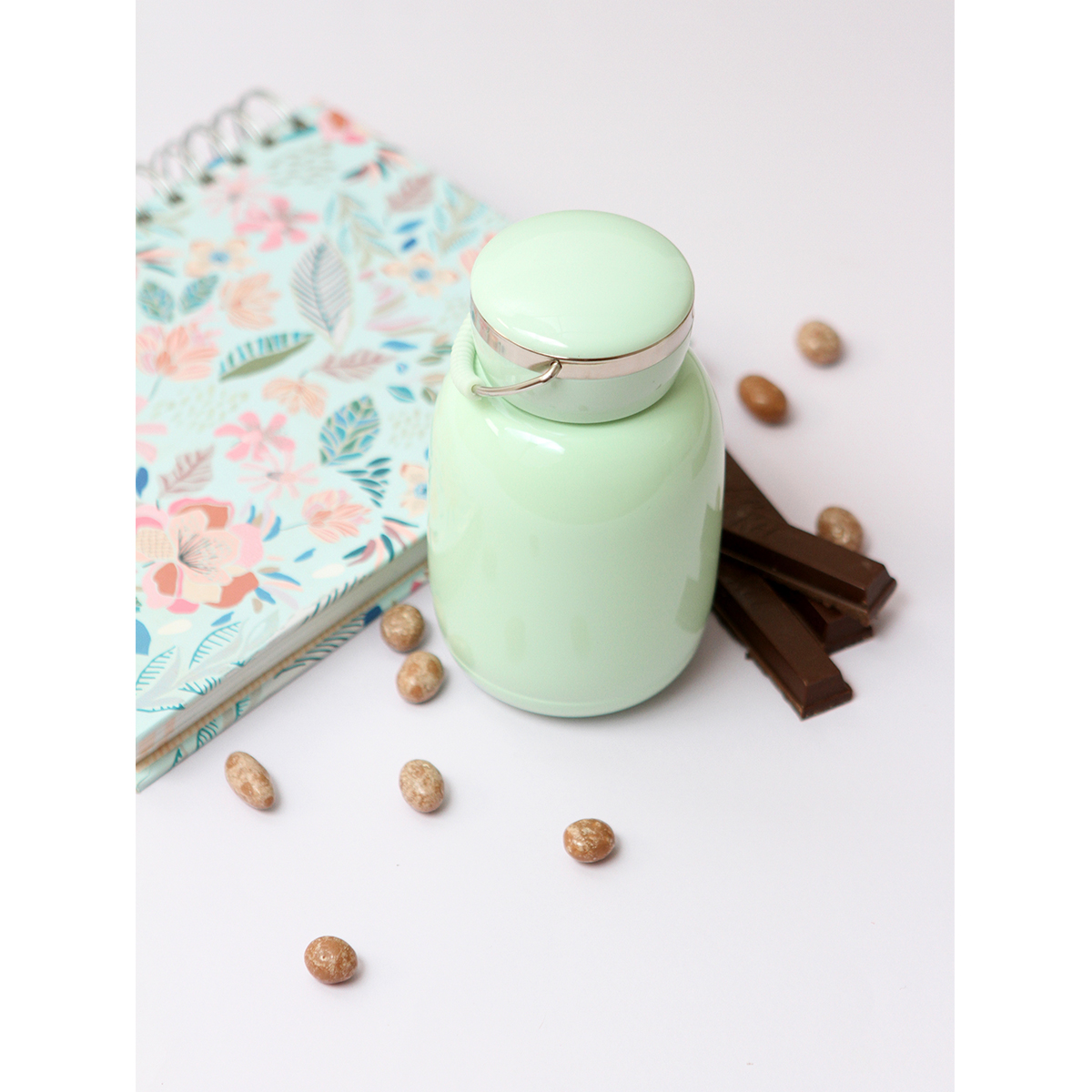 Termo Solano. - Termo de acero inoxidable doble pared con tapa de plástico, asa metálica y detalle de color en asa. Fabricado en materiales de grado alimenticio, mantiene bebidas frías o calientes por un largo tiempo. No usar en microondas. Capacidad 230 ml. Incluye caja de cartón individual.