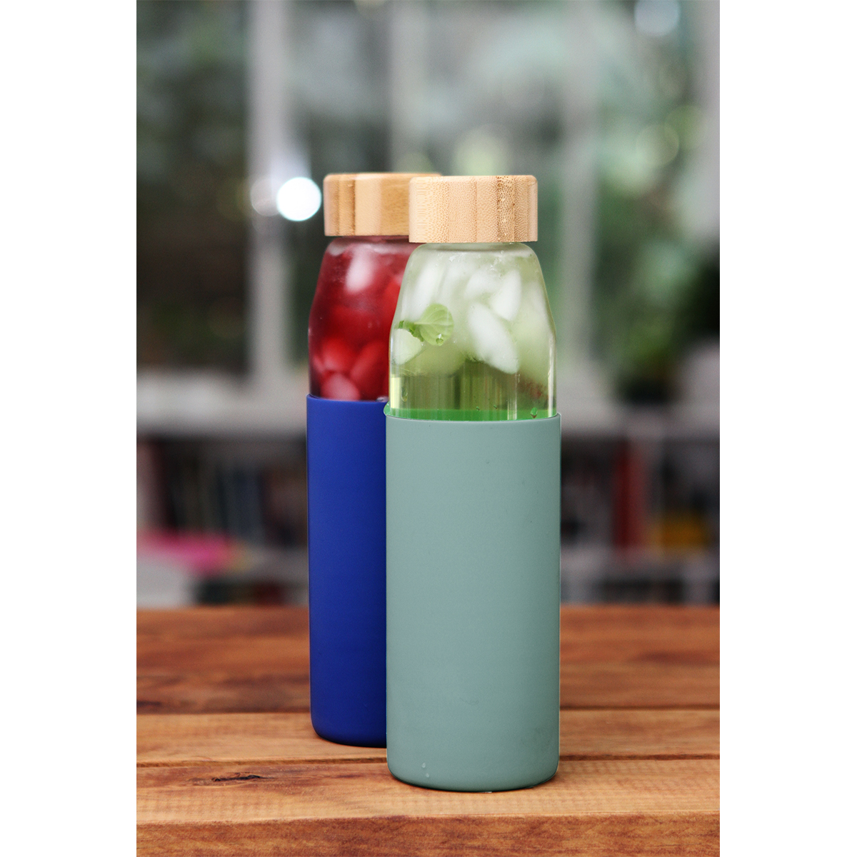 Botella Marineo. - Botella de vidrio de borosilicato con manga de silicón y tapa tipo rosca fabricada en bambú. Capacidad de 550 ml. Esta botella para agua está fabricada en materiales de grado alimenticio, su manga de silicón brida seguridad al agarre y versatilidad en su diseño. Incluye caja de cartón individual.